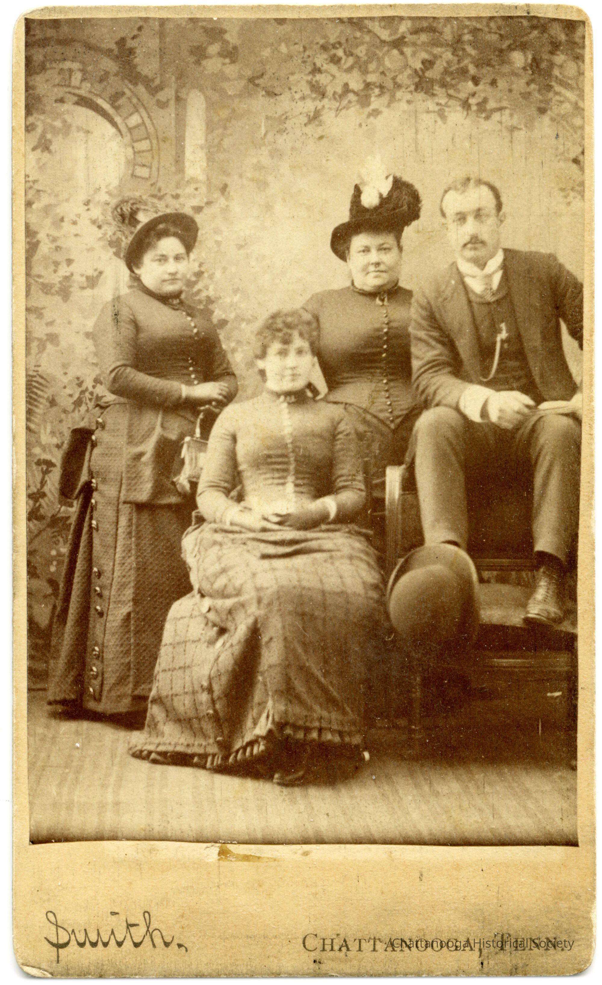 Black and white studio CDV of a man, and women with two young women. The man is sitting on the back of a chair with his feet on the chair seat. He is wearing a dark, three-piece suit, white shirt, and tie. There is a watch fob going from his vest button to vest pocket. He has a receding hairline. His bowler hat is resting on his right foot. The woman stands next to the man, with a younger woman to her right. Another young woman is sitting in a chair next to the man. The three women are dressed in long, full skirts and tight fitted bodices made of a heavy-weight material. The bodices have tight sleeves, closely spaced buttons running down the front, and short collars with ruffles. The two women standing are wearing hats with feather embellishments. The woman sitting is not wearing a hat and her skirts are windowpane plaid. On the floor is a striped rug and the studio backdrop suggests foliage in an enclosed garden. At the bottom, on the matboard, it says “Smith, Chattanooga, Tenn.”Photograph Details