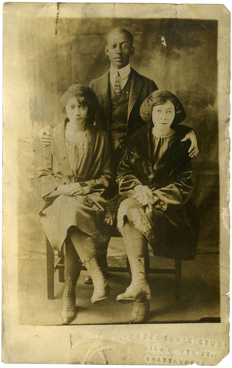A black and white photograph developed on postcard paper of a man standing behind two seated women with a hand on their shoulders. The man is wearing a three piece suit with a patterned tie. The woman on the left is wearing a embroidered or patterned dress with a brown coat over it. The woman on the right is wearing a dark dress with stylized embroidery on the hem and a dark velvet coat with wide lapels. Both women have leather ankle height boots with short heals. The photograph is embossed "Brazelton's Studio, 513 1/2 E. 9th Street, Chattanooga".Photograph Details