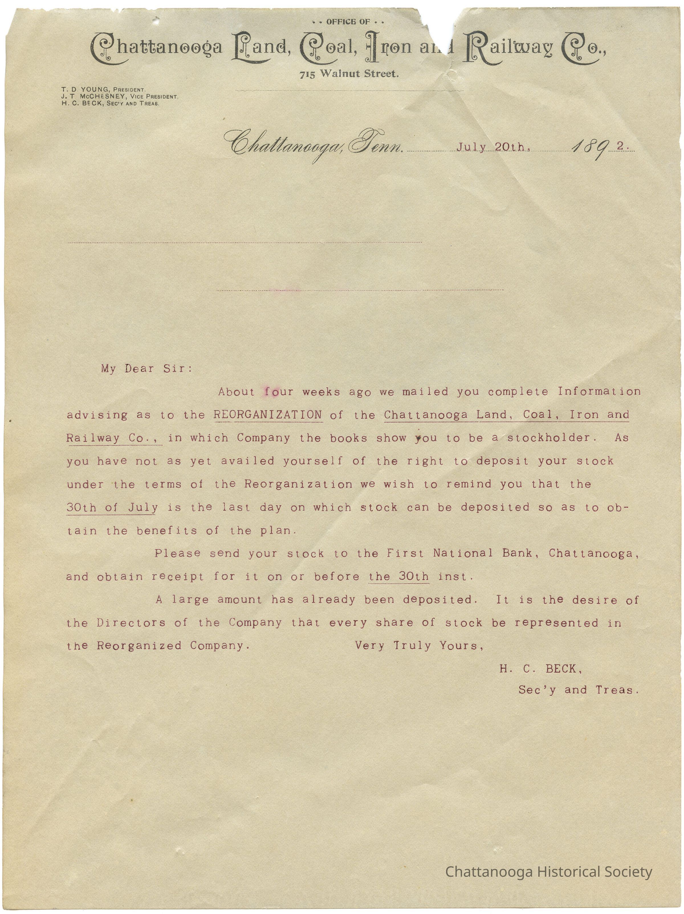 About four weeks ago we mailed you complete Information advising as to the REORGANIZATION of the Chattanooga Land, Coal, Iron and Railway Co. in which Company the books show you to be a stockholder. As you have not as yet availed yourself of the right to deposit your stock under the terms of the Reorganization we wish to remind you that the 30th of July is the last day on which stock can be deposited so as to obtain the benefits of the plan. Please send your stock to the First National Bank, Chattanooga, and obtain receipt for it on or before the 30th inst. A large amount has already been deposited. It is the desire of. the Directors of the Company that every share of stock be represented in the Reorganized Company.