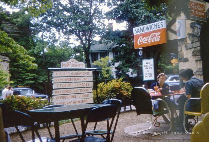 A 35mm Kodachrome Transparency slide negative of two women having lunch at Point Lookout on Lookout Mountain, Tennessee. The image from the negative shows two women sitting on a patio enjoying a meal at the café at Point Lookout. A sign at center offered a portion of the menu, including "Toasted Sandwiches, Soups, Baked Beans, Chili, Delicious Sundaes, Milk Shakes, Malted Milks, Refreshing Sodas" as well as a not to "Please Pay When Served". A large Coca-Cola sign is attached to the overhang of the café (now the visitors center for the National Park Service). A sign below that reads "Mail a Post Card From Here to the Folk's Back Home". An advertising sign for Sealtest Ice Cream can be seen hanging above the two women. The stone castellated tower of the Point Park entrance can be seen at the left edge as well as the front side of 1117 E. Brow Road at center.Photograph Details