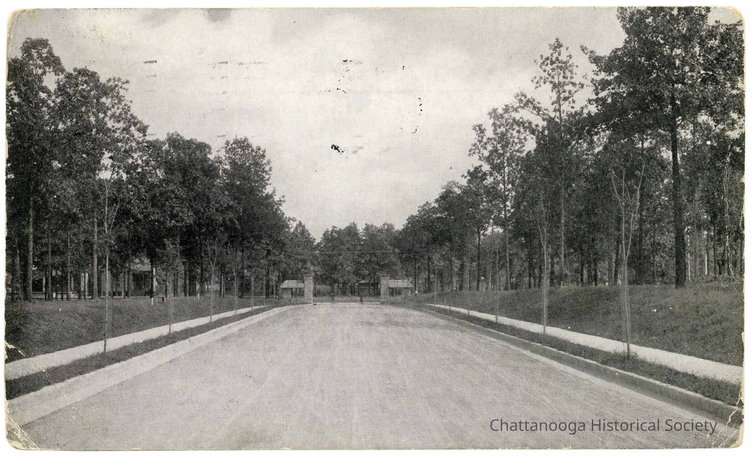 A postcard with the front showing a photograph of the gates of Ferger Place, and a newly developed Holly Street in Chattanooga, Tennessee.
