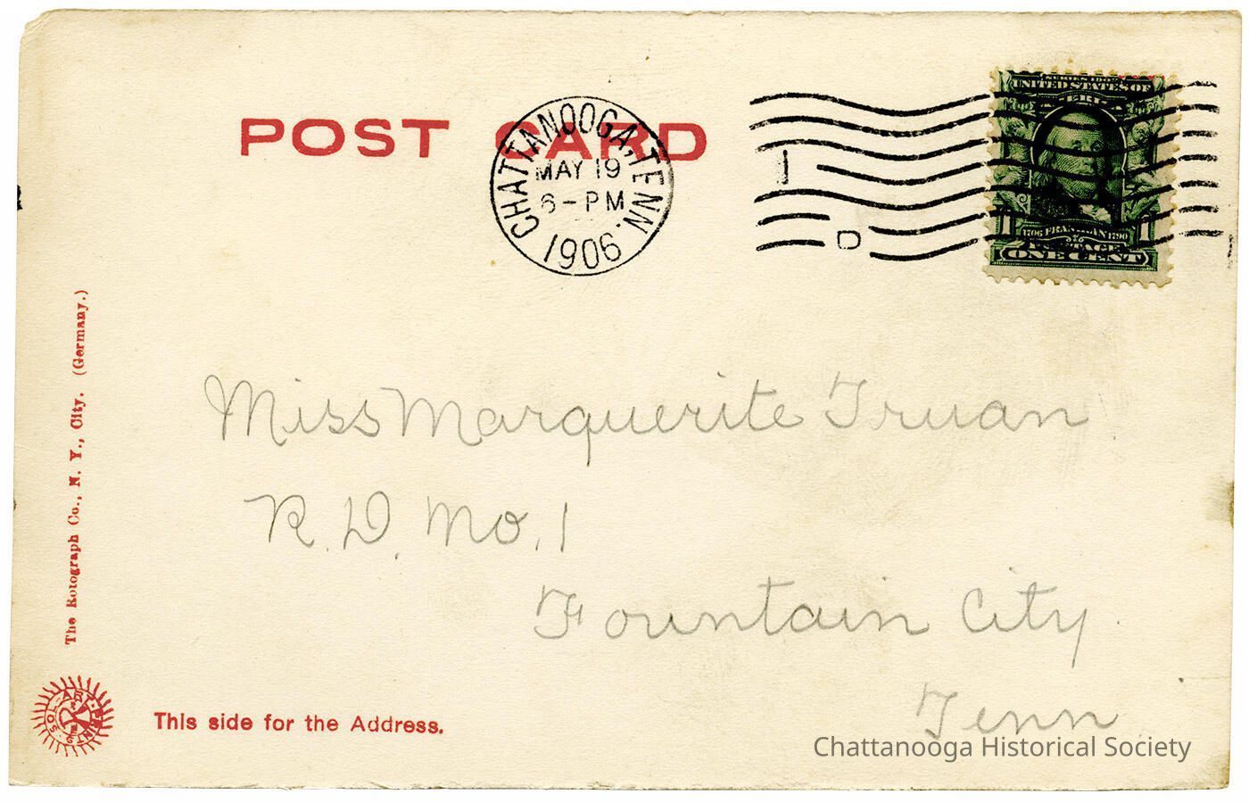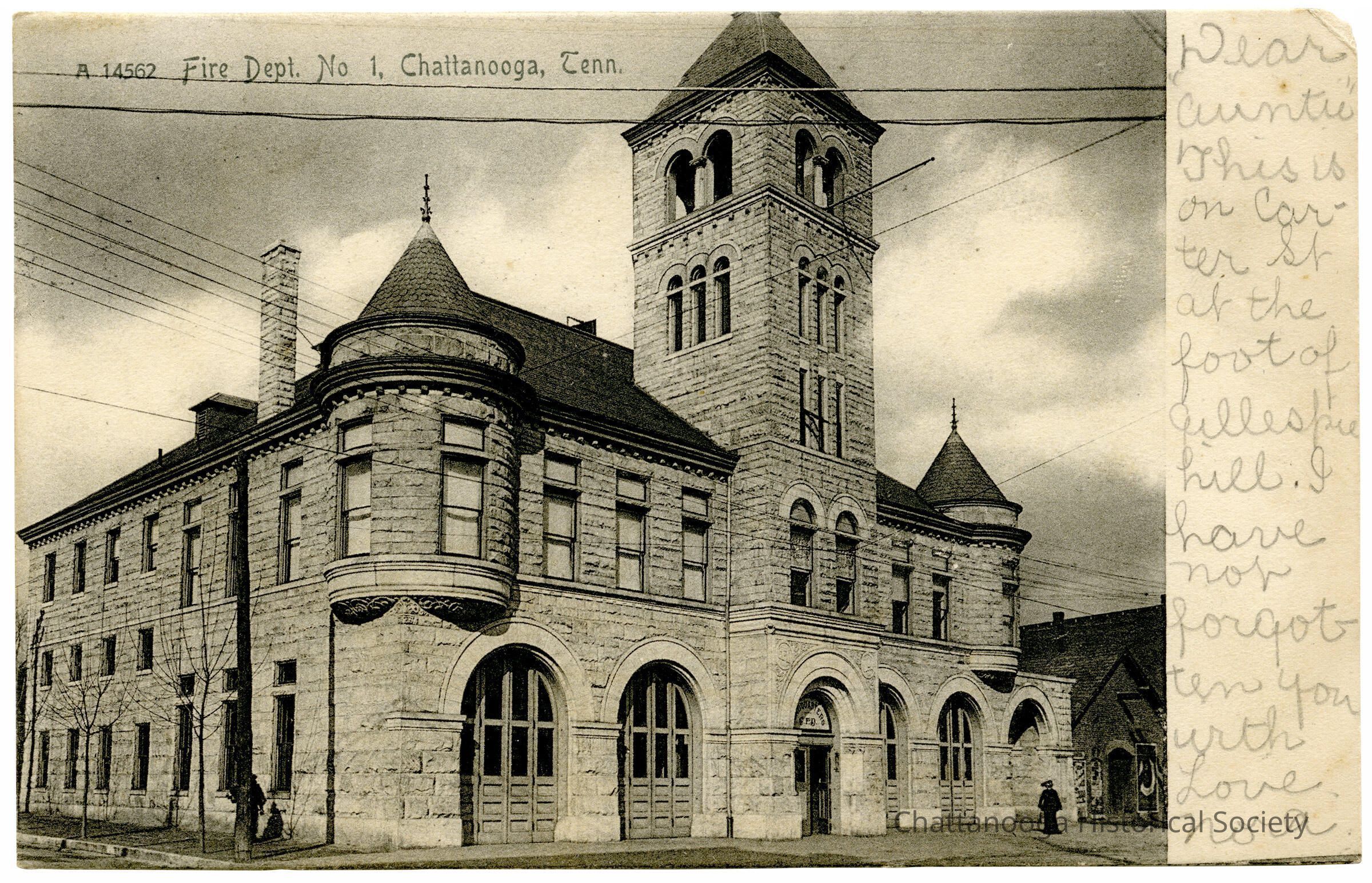 A postcard with the front showing a photograph of Chattanooga Fire Department No. 1, located on Carter Street at the foot of Gillespie Hill. The Richardson Romanesque fire department featured a center campanile and two corner turret extensions and six bays, five of which have wide garage doors for trucks.Subject Person/Organization