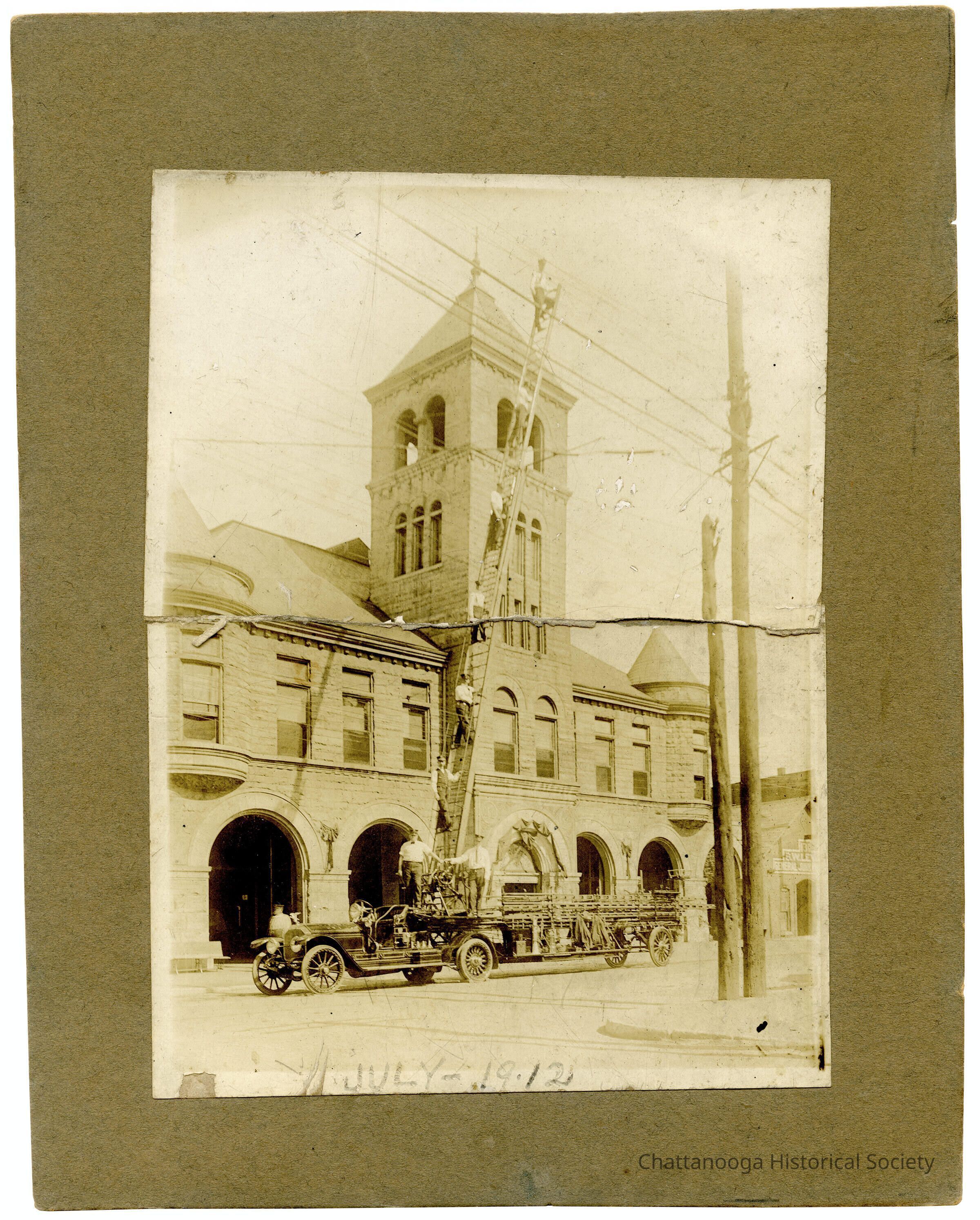 A photograph mounted on a thick carding showing Fire Department Number 1, with a group of firemen posing on the extended ladder of a fire truck in front of the building. The photograph is dated July 1912 and shows the ladder truck parked in front of the Richardson Romanesque style building. The extended ladder sits in front of the station's campanile style bell tower. There are six men standing on the ladder, with one man at the very top. There are two men at the base of the ladder, on the top of the truck. The truck, likely an American LaFrance Ladder Truck, has a long extended rear with various ladders and hoses. The building is decorated with swag in between the archways and above the main entrance. "July - 1912" is written on the bottom in pencil.Photograph Details