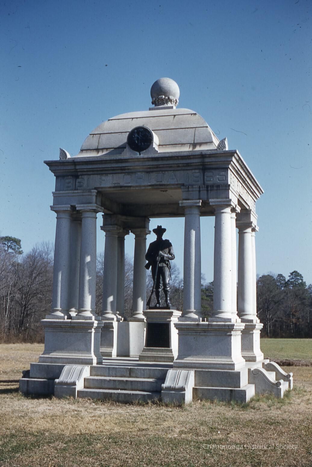 A Kodachrome Transparency slide showing the Florida monument at the Chickamauga Battlefield. The open pavilion monument, which was erected in 1912 by the state of Florida, is at center and features a statue by L. Mihlimm of a soldier standing on a pedestal at parade rest.