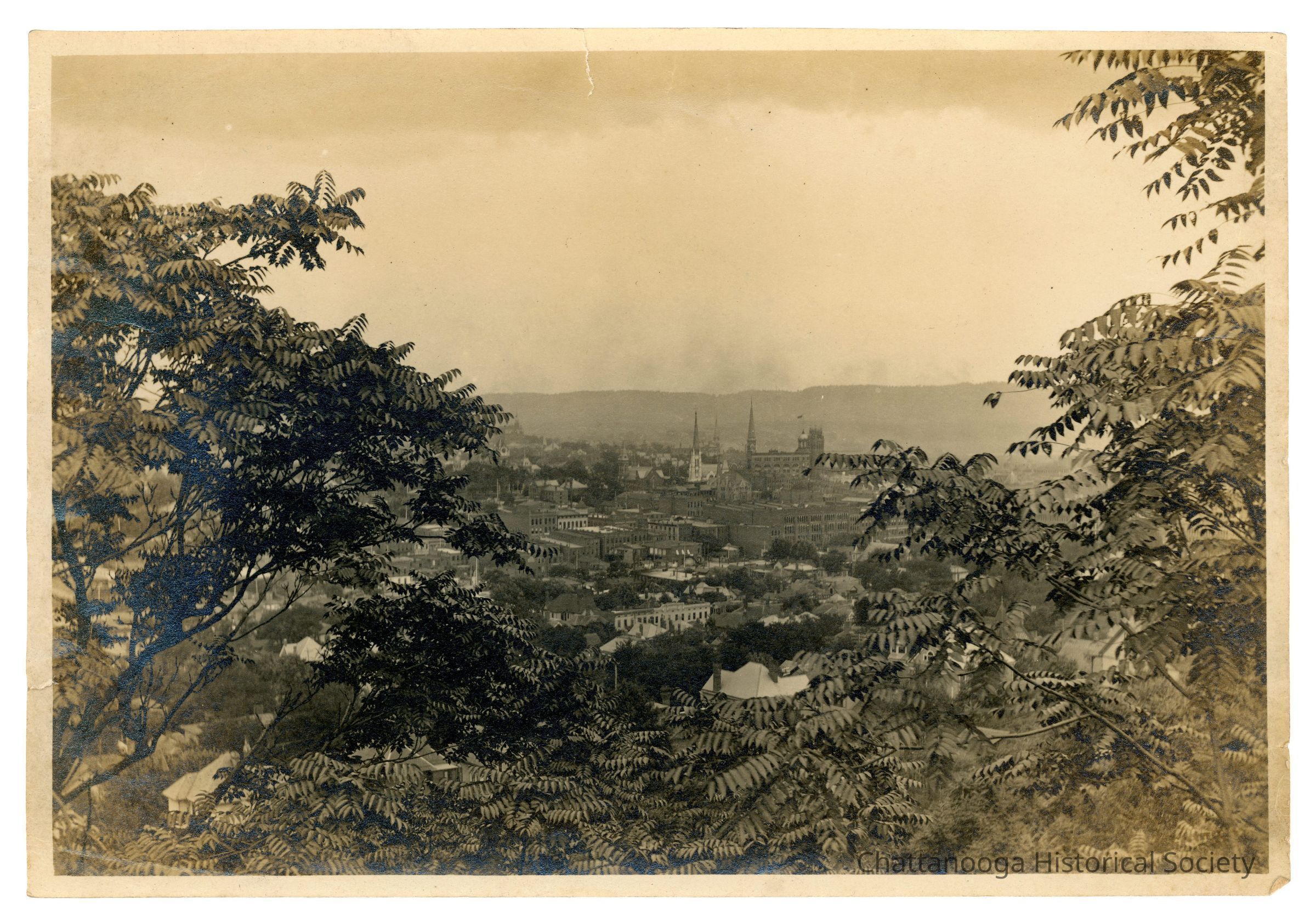 Black and white photograph of downtown Chattanooga through the trees, taken from Lookout Mountain. The Dome Building, Old Stone Church (First Methodist), St. Peter and Paul, and other Chattanooga buildings can be seen.Container
