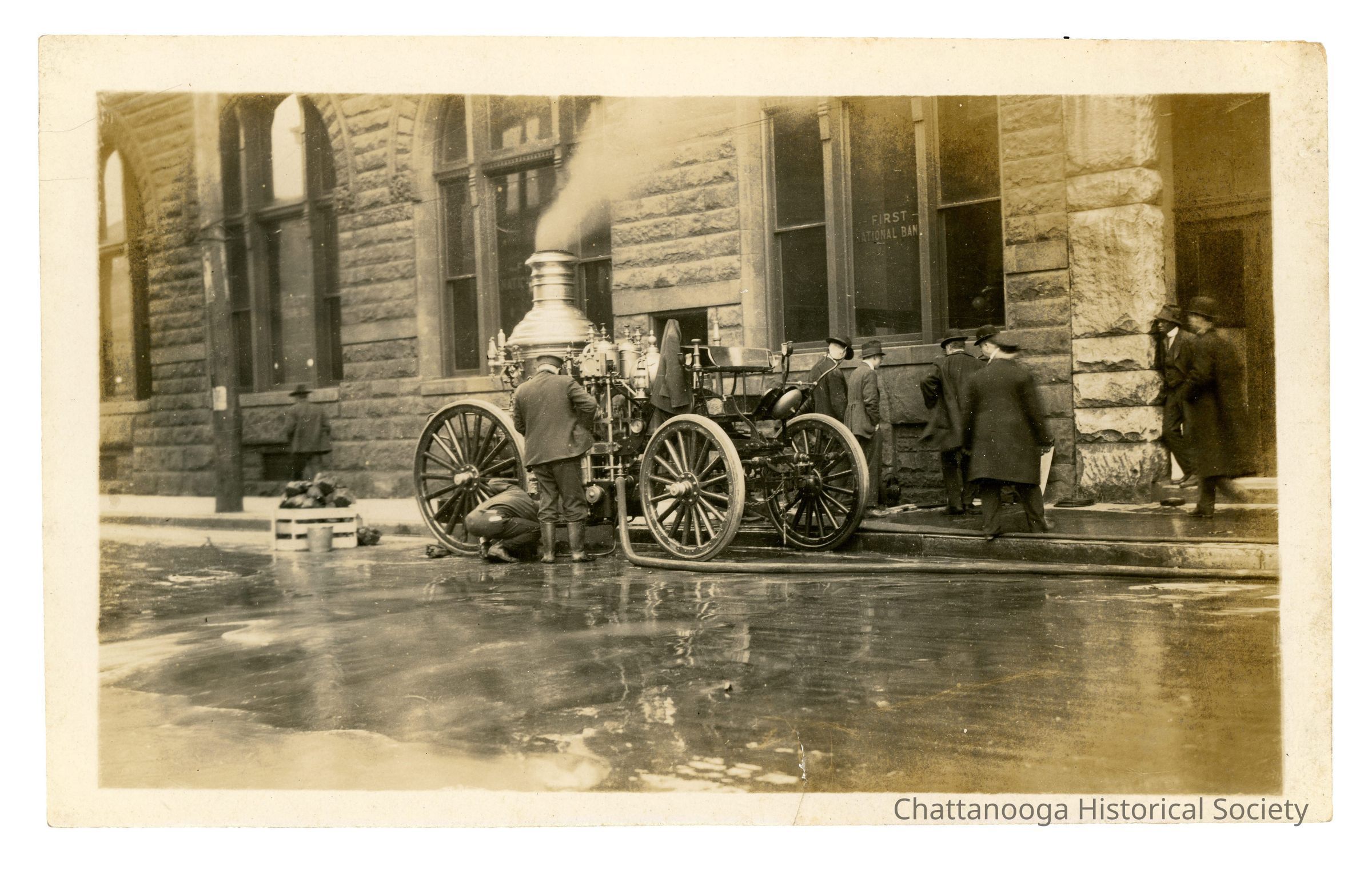 Black and white photograph of a Steam Fire Engine on 9th Street, beside the First National Bank. The photograph shows two members of the Chattanooga Fire Department inspecting the bottom of the steam engine with several other men looking at the building itself.Container