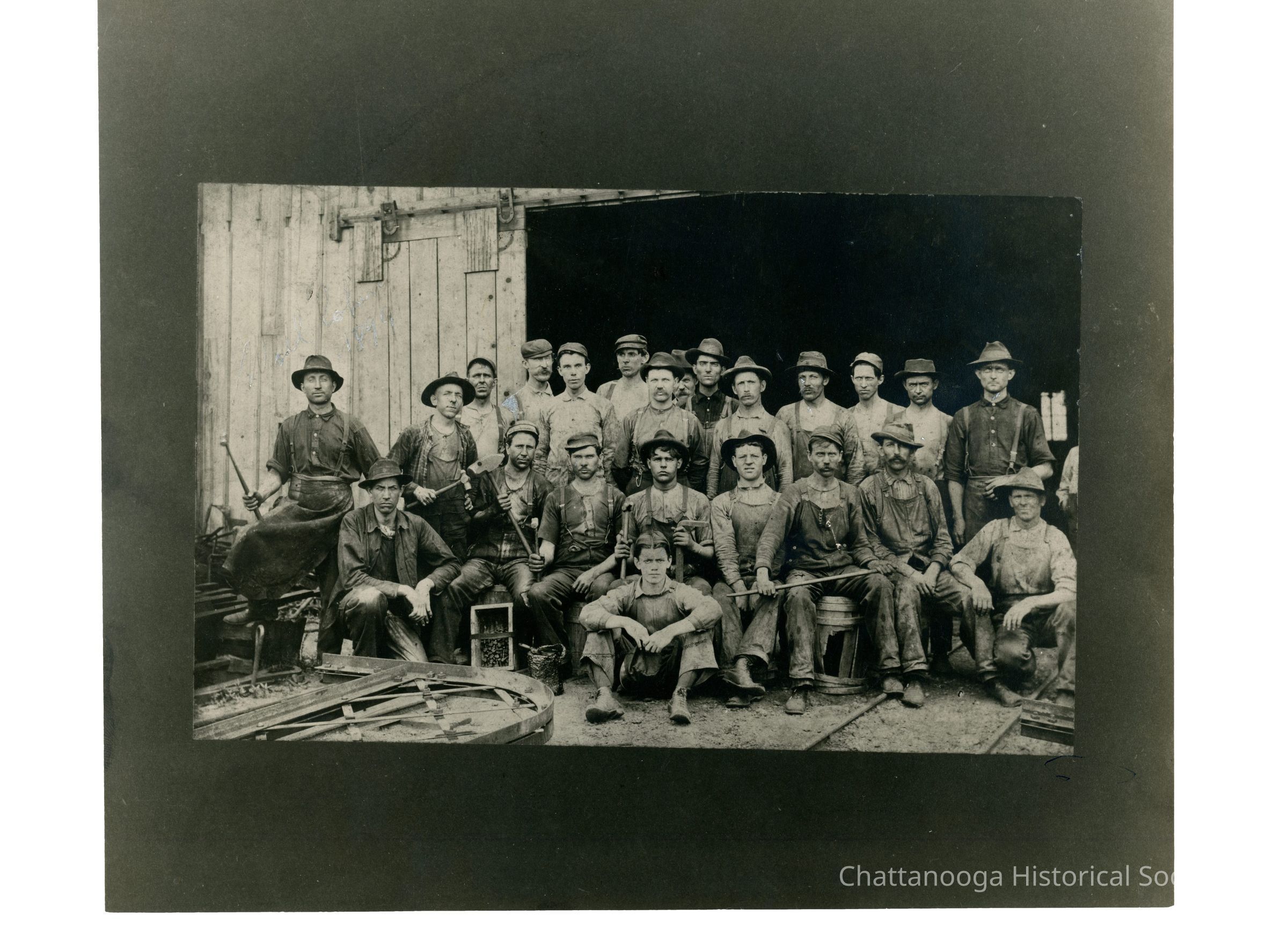 Black and white photograph of [steel?] workers sitting in front of a warehouse door. Someone has written [?] Cohen | 1899" but it has been "edited" out with white paint.Date(s) of Creation