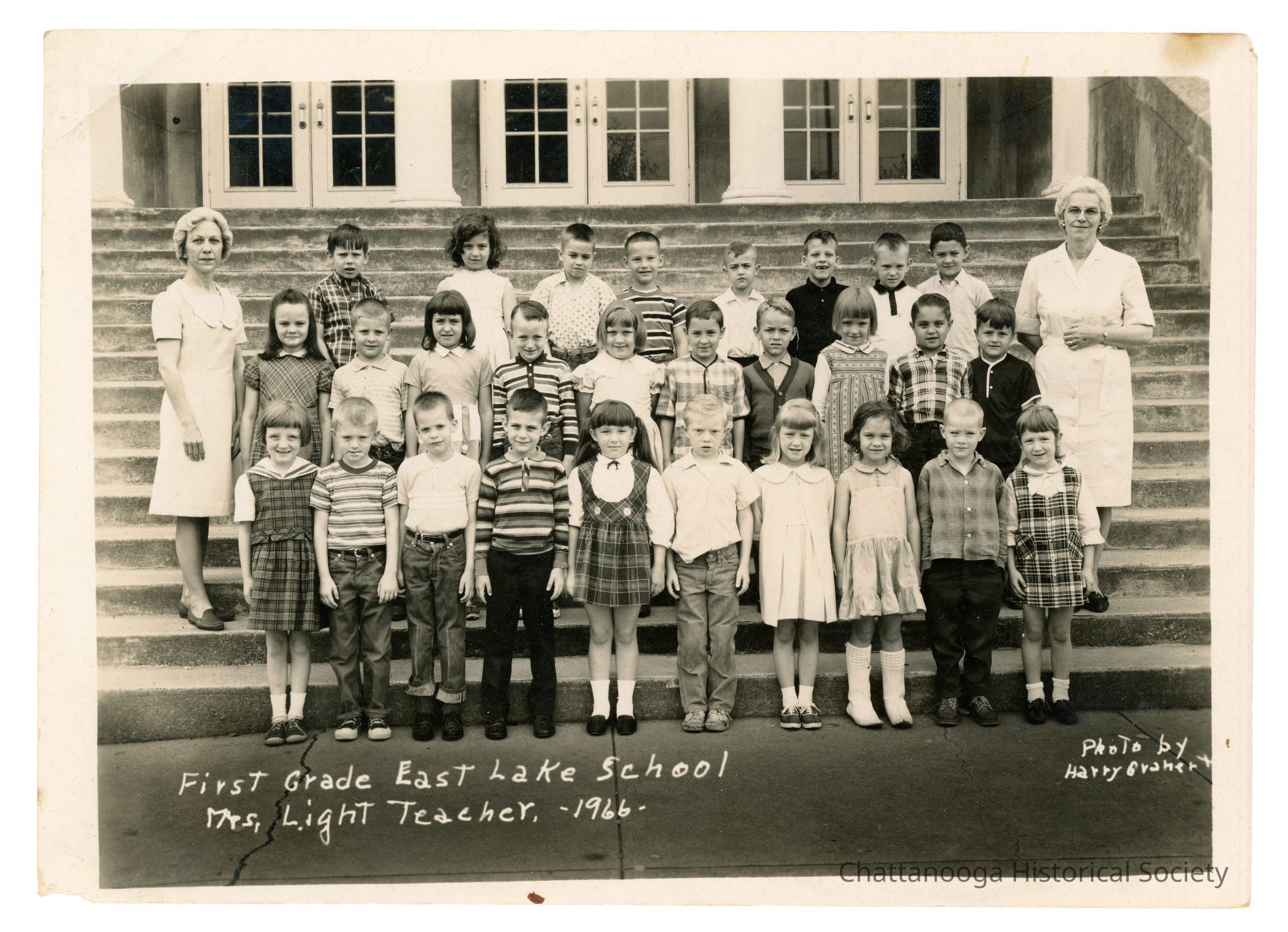 Black and white photograph of the First Grade class of East Lake High School in 1966 with teacher Mrs. Light. The image shows three rows of students, with Mrs. Light and another, unidentified woman. Photo by Harry Granert.Creator