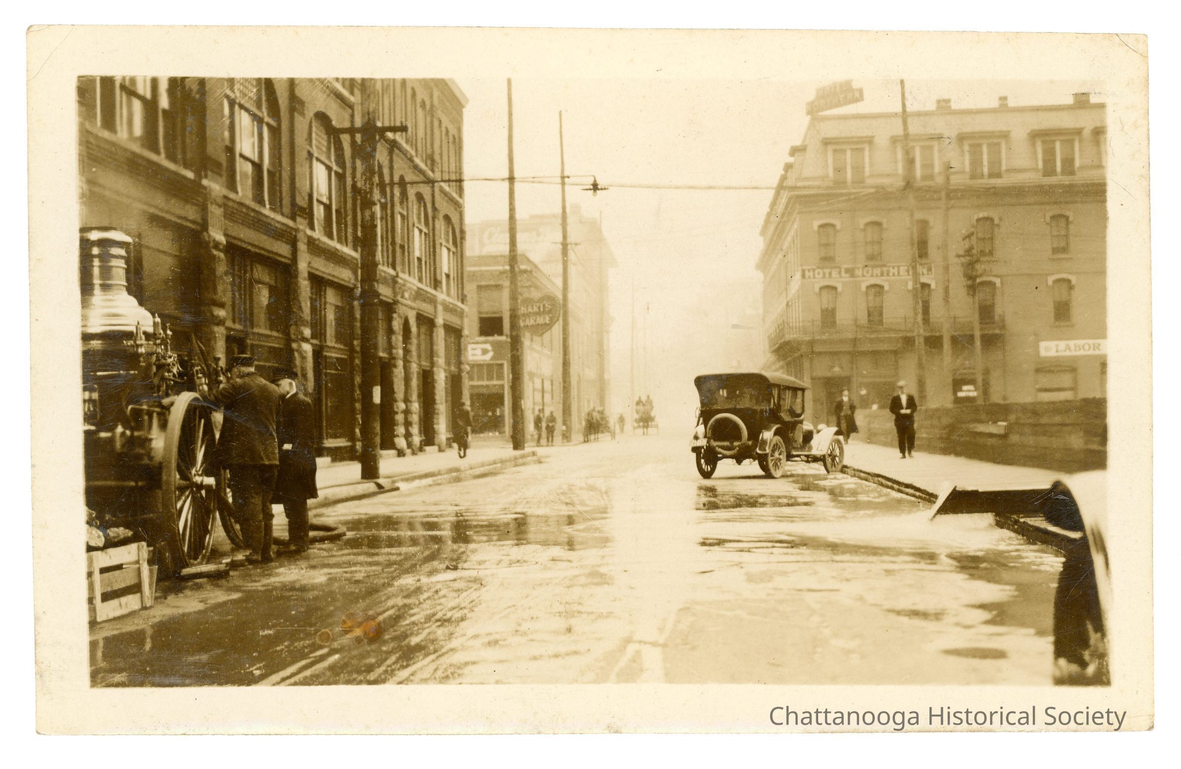 Black and white photograph of the intersection of Market and 7th Streets with the Chattanooga Fire Department's Steam Powered Fire Engine parked beside the First National Bank. The Hotel Northern can be seen at right, with Hart's Garage across the street.Container