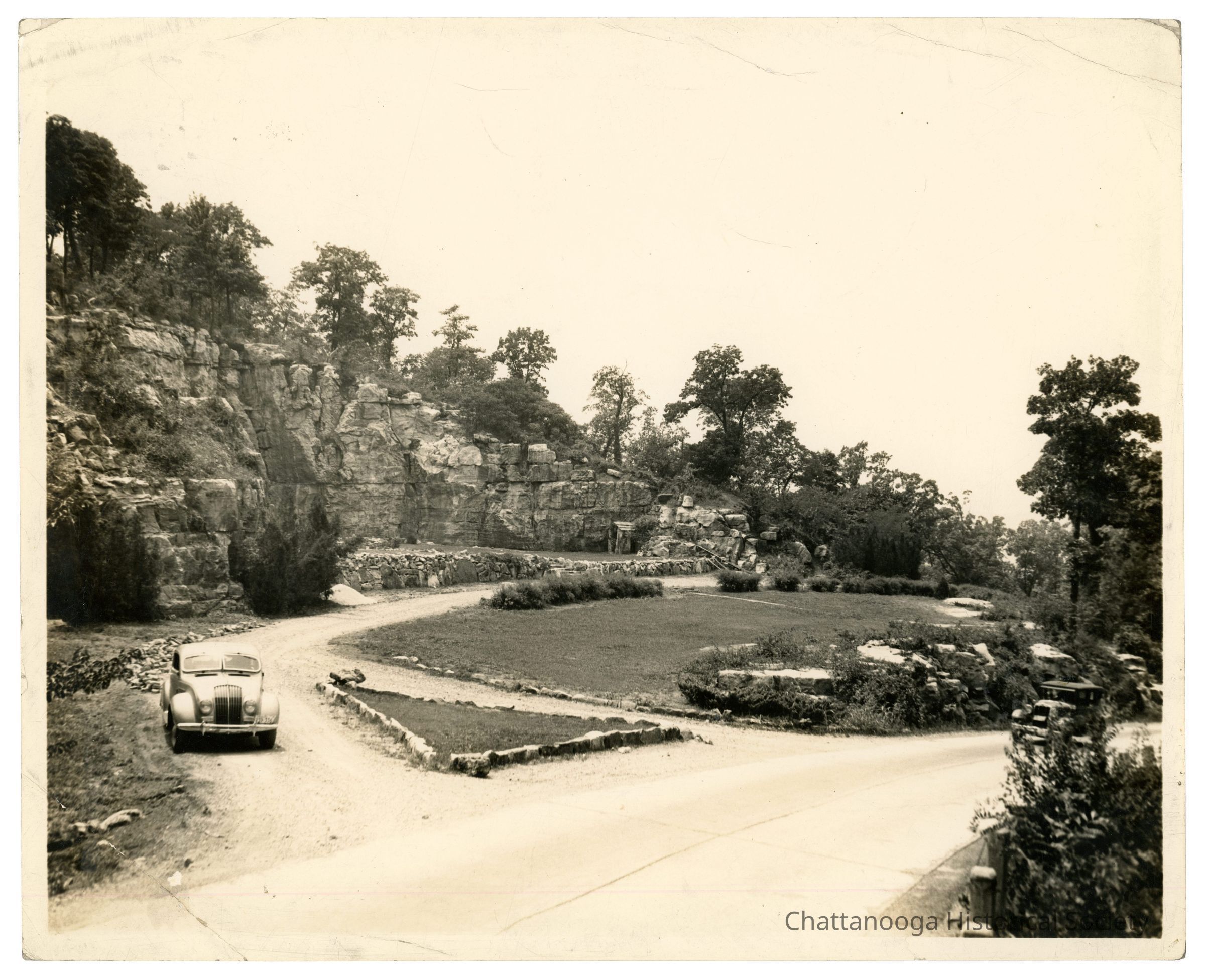 Black and white photograph of the Eagle's Nest gardens on Lookout Mountain. A car is parked in the drive with the quarry walls behind it. An older model automobile is driving up Scenic Highway, towards Ruby Falls.Container