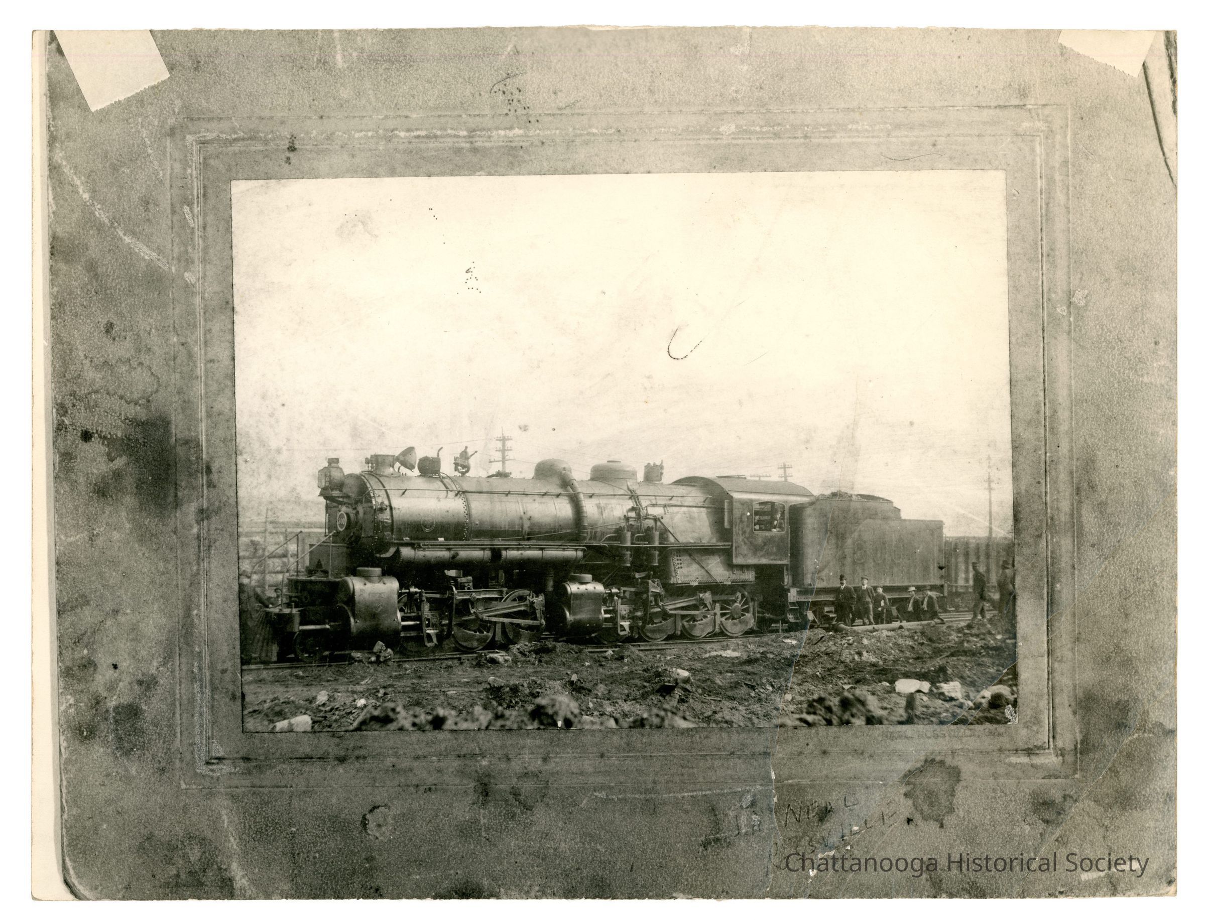 Black and white photograph duplicate of a cabinet card showing a train engine with the engineers and workers posing. Faintly at the bottom is "J Neal | Rossville"Container