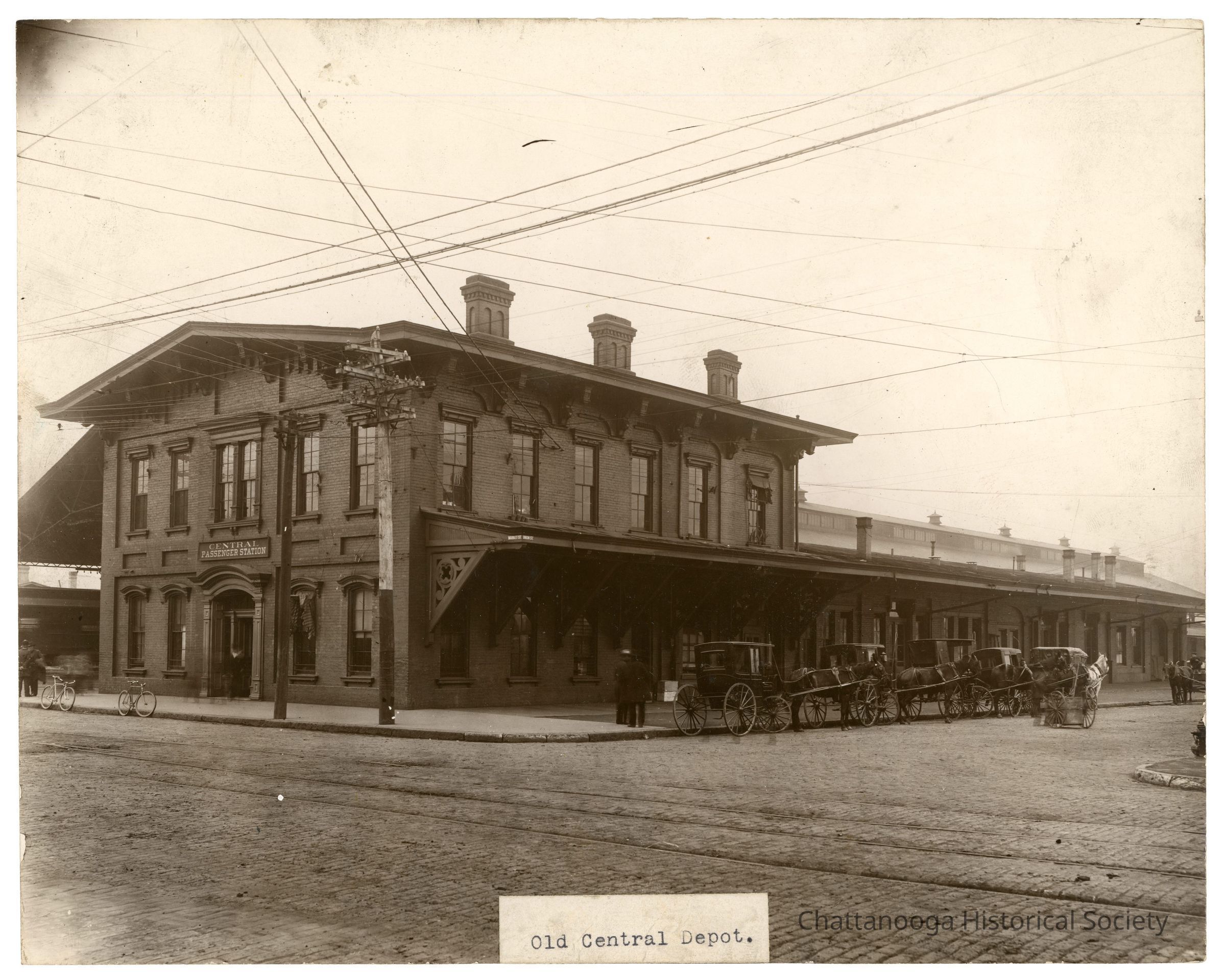 Black and white photograph copy of downtown Chattanooga and the Western & Atlantic Railroad depot (Central Depot) that was once on the southwest corner of Market Street and 9th Street in 1864. Photograph possibly attributed to Mathew BradyDate(s) of Creation