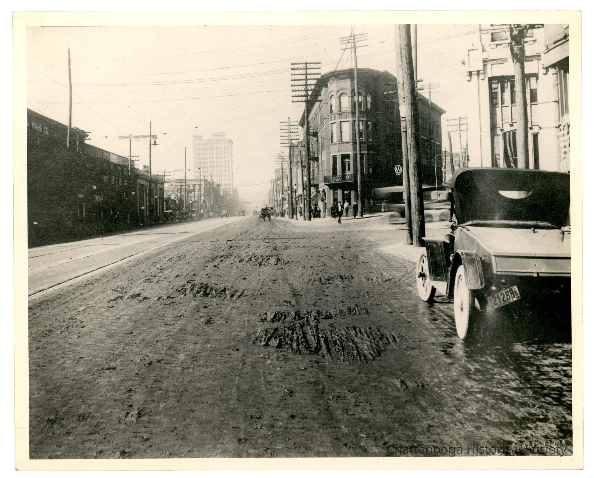 Black and white photograph of Broad Street. Several Chattanooga businesses can be seen on Broad and Market StreetsContainer