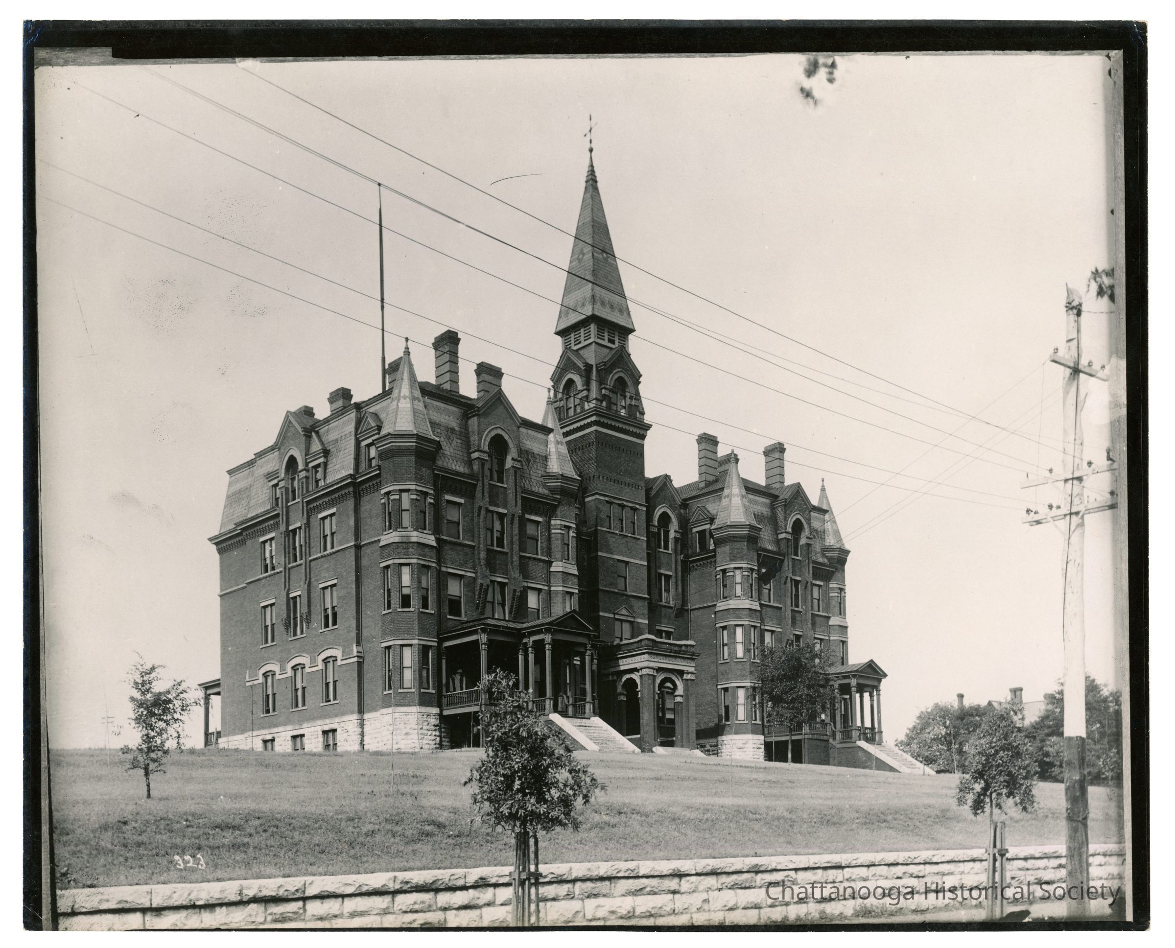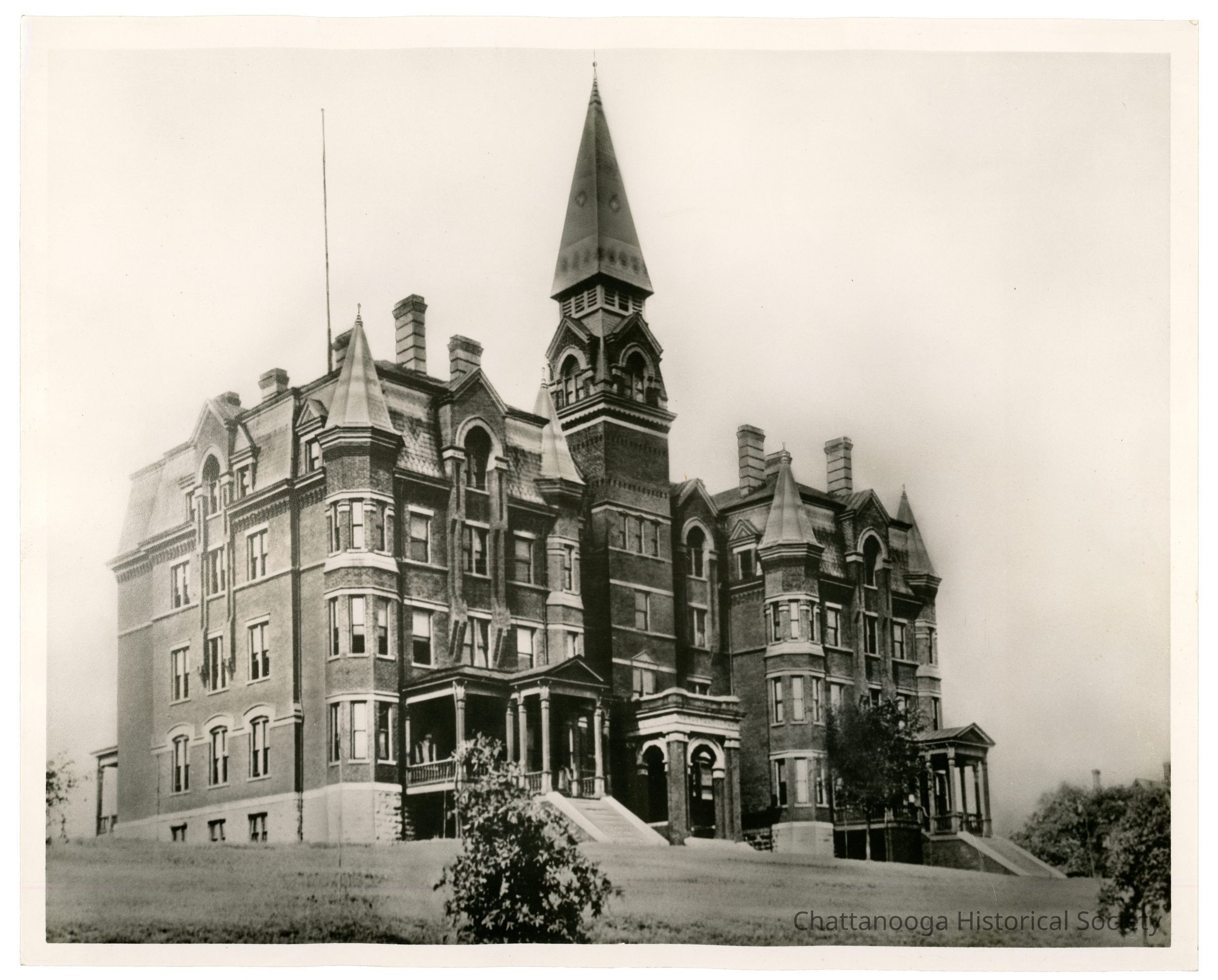Black and white photograph of Old Main, the original building on the campus of Chattanooga University. The building, officially known as University Hall, housed science laboratories, a chapel, 39 dormitory rooms, and apartments for the president and faculty members. The four-story building was demolished in 1917.Creator