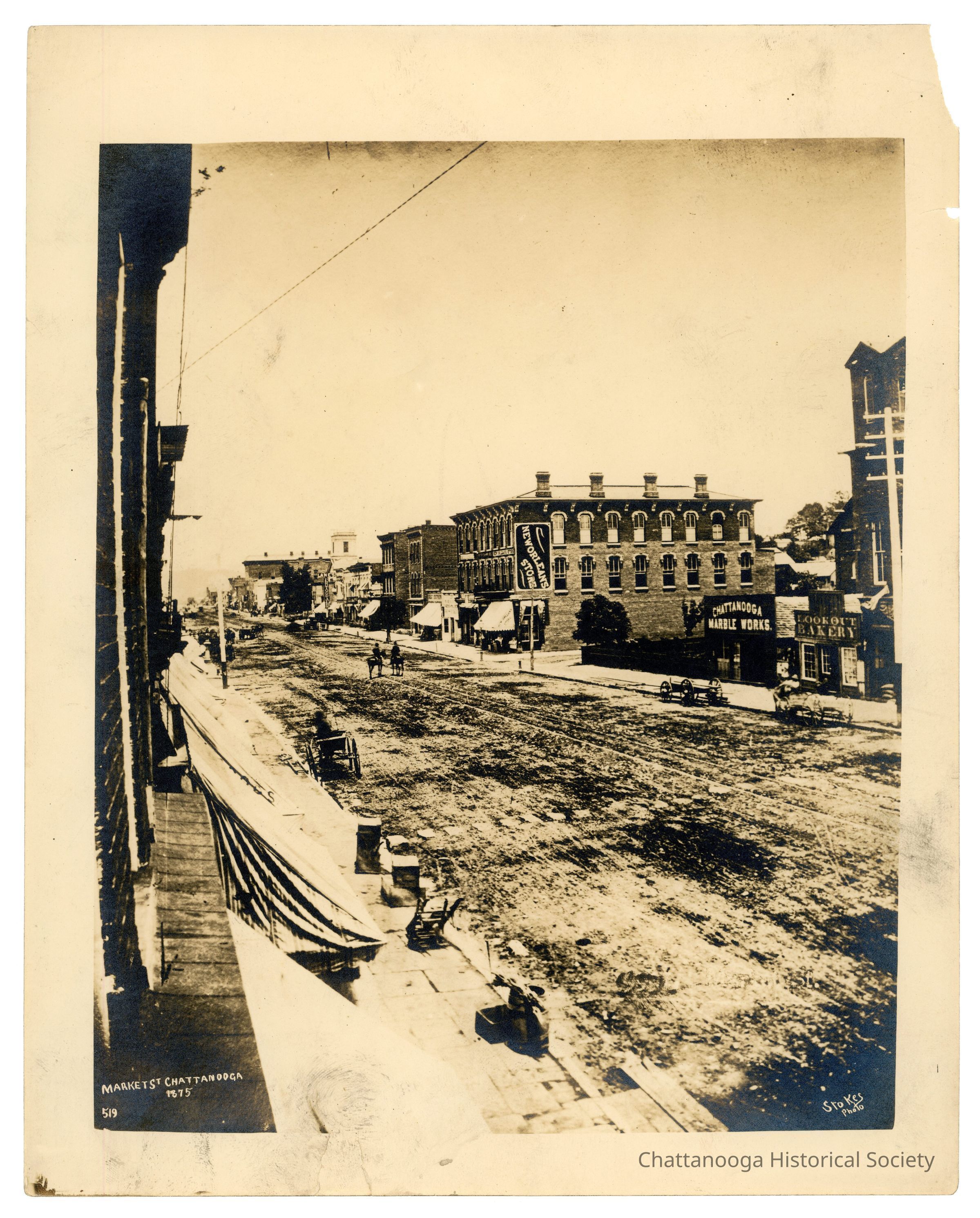 Black and white photograph of Market Street in 1875. The wide, dirt street has wagons as well as men on horseback. Shops on the right side of the street include the New Orleans Store, Chattanooga Marble Works, Lookout Bakery, and Lanes Photographs.Creator