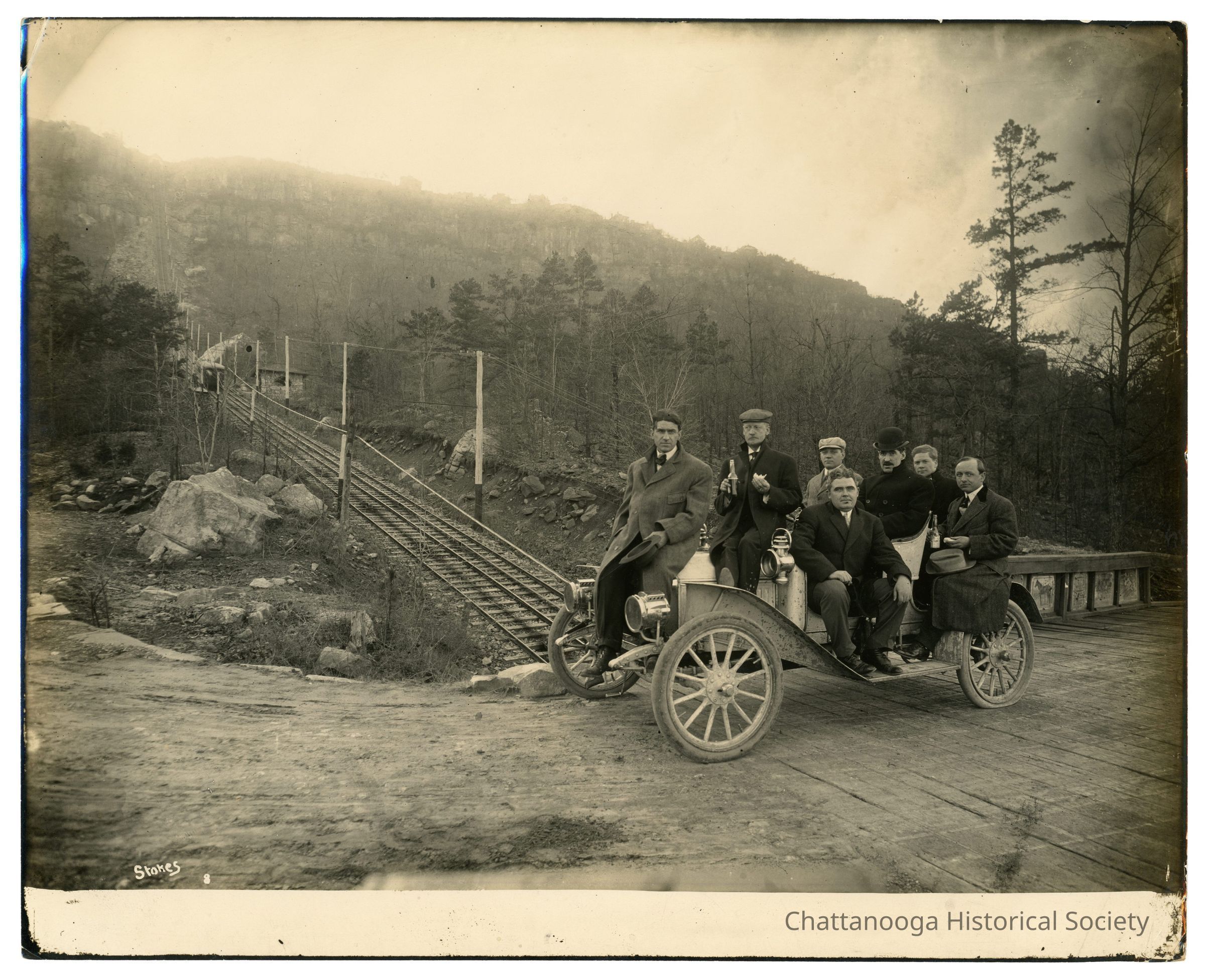 Black and white photograph of a group of seven men sitting in an open touring car on the bridge over the tracks of Incline Number 2. The incline's tracks can be seen extending up Lookout Mountain, with the stop for Battlefield Station in the midground. The rail of the bridge they are parked on has several advertisements for animal feed. Two of the men are eating sandwiches and drinking beer. The photograph is marked "Stokes | 8" at bottom left.Creator