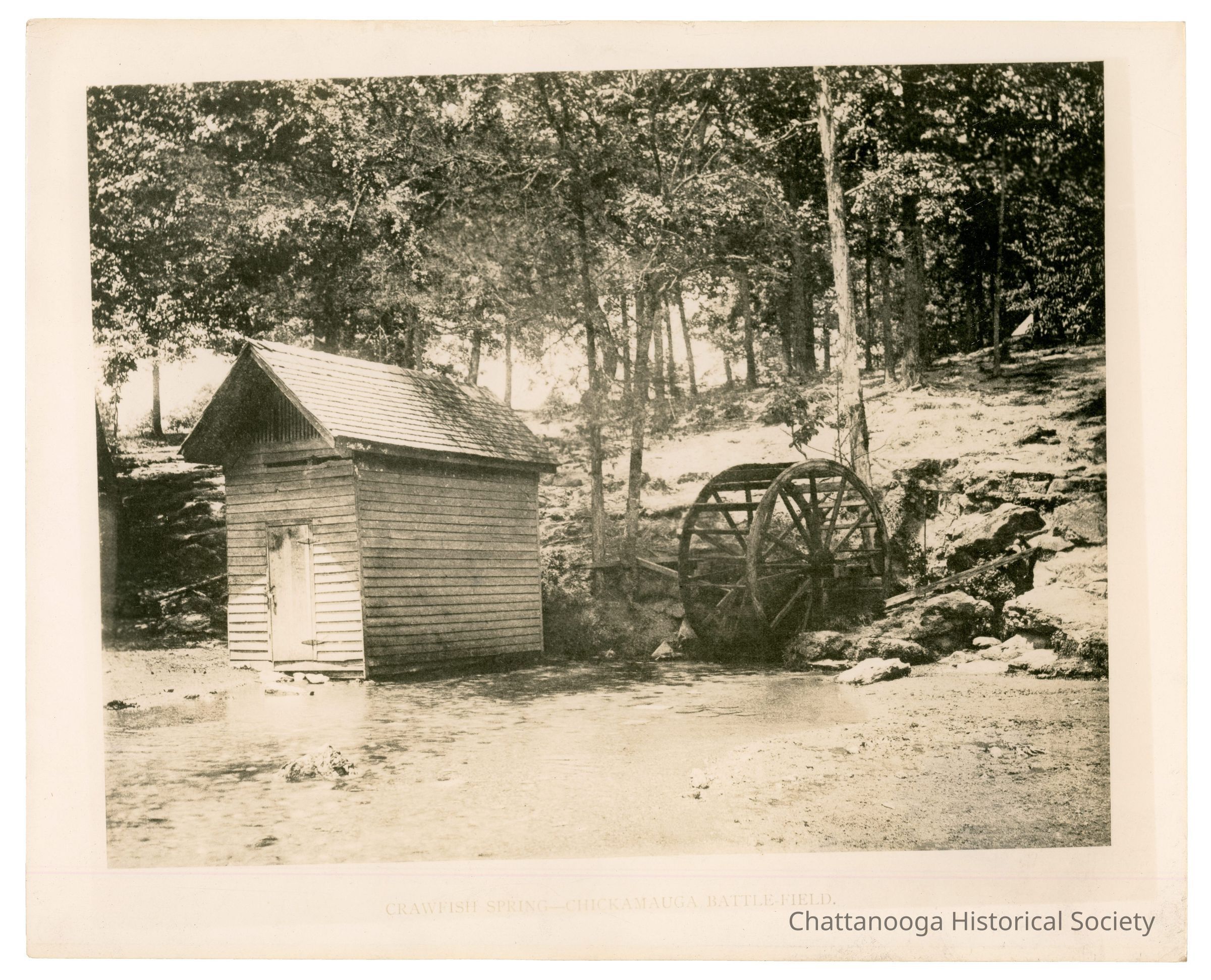 Black and white photographic copy of a photograph of Crawfish Spring at the Chickamauga Battlefield. The photograph shows a wooden water wheel with a small wooden shed beside.Container