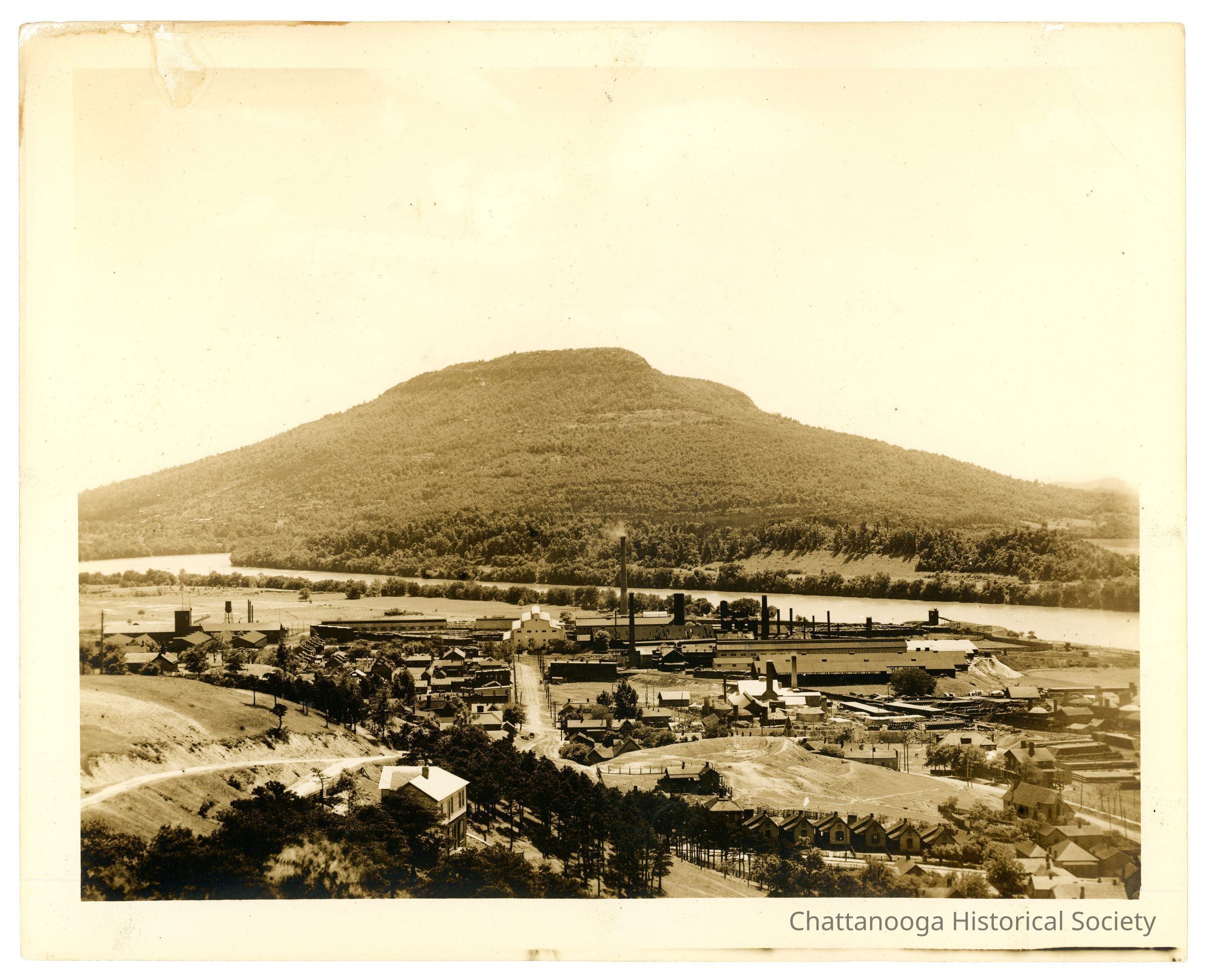 Black and white photograph of Lookout Mountain, Tannery Flats, and Moccasin Bend from Cameron Hill. Rubin and Siskin Iron and Metal (est. 1900) can be seen in the midground. "Lookout Mt. from Chattanooga" is stamped on the rear with "by G.T. Lynn" handwritten above.Creator