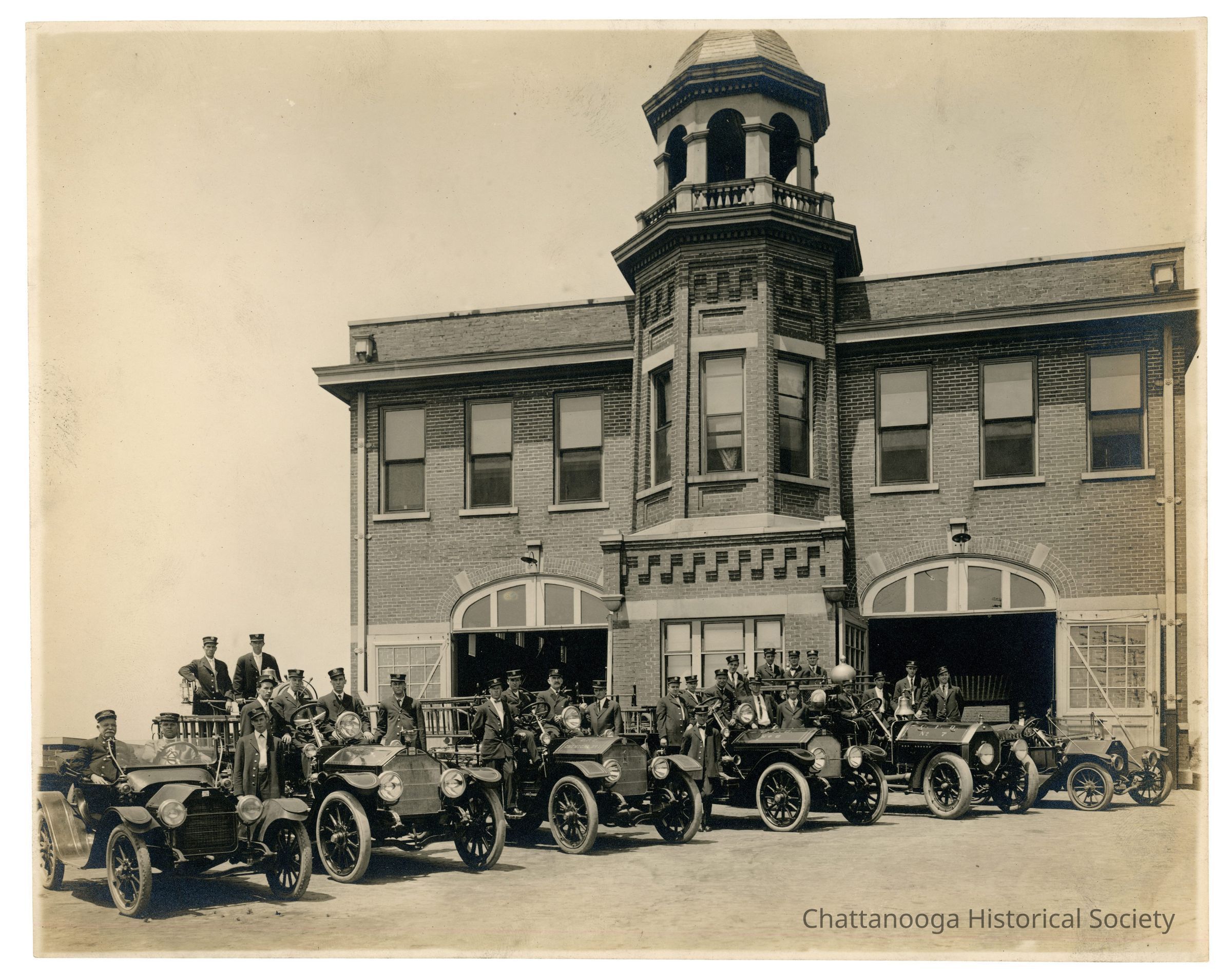 Black and white photograph of the fire station on Cameron Hill with firemen and CFD staff and engines in front. The engines are marked "C.F.D." with their engine numbers below.Container