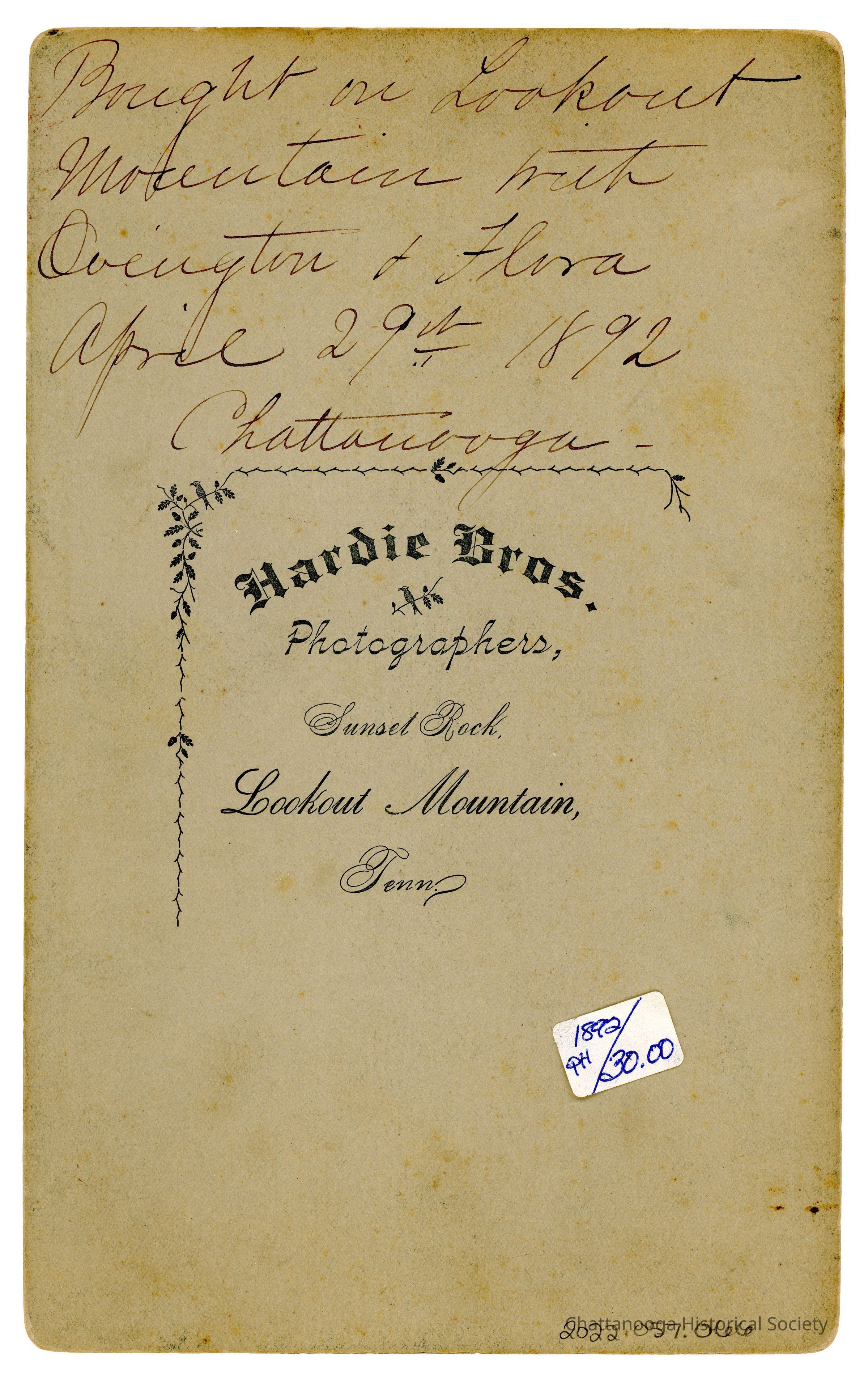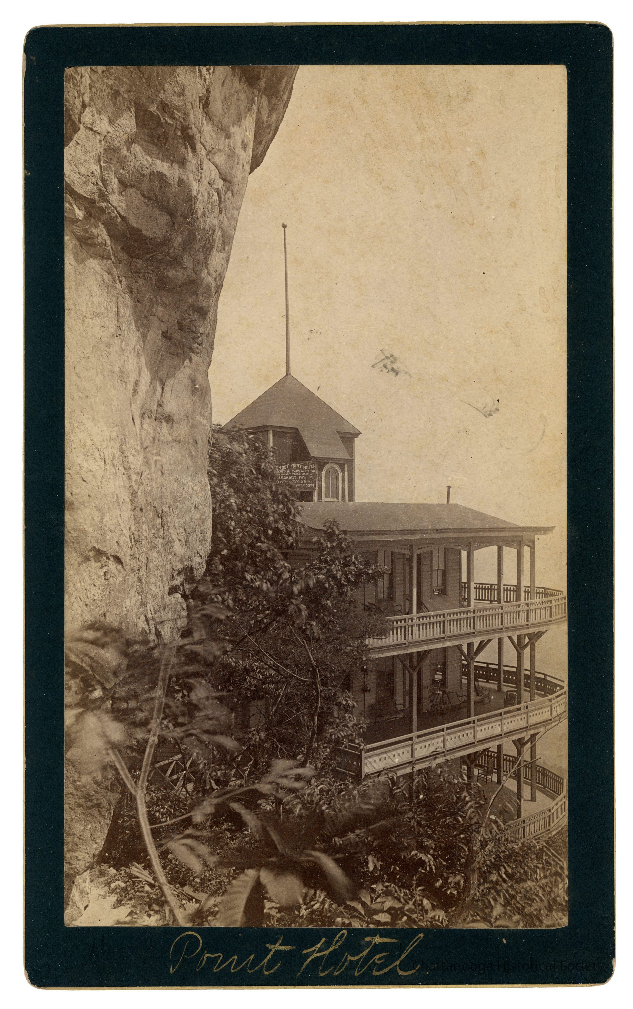 Black and white photograph on cabinet card showing the Point Hotel on the side of Lookout Mountain. The side elevation of the hotel is shown, with three porches with wooden furniture on each level. A belvedere at the top of the hotel has a sign that reads "Lookout Point Hotel | Reached By Cars At Station | Three Hundred Yards - Rear of | Lookout Inn. | Fare to City 25 cts | [?] Union Depot | [?]" Written in ink on the verso is "Bought on Lookout Mountain with Ovington & Flora April 29th 1892 Chattanooga -" . Printed at center is "Hardie Bros. | Photographers, | Sunset Rock, | Lookout Mountain | Tenn." and a sticker "1892 | PH | 30.00"Creator