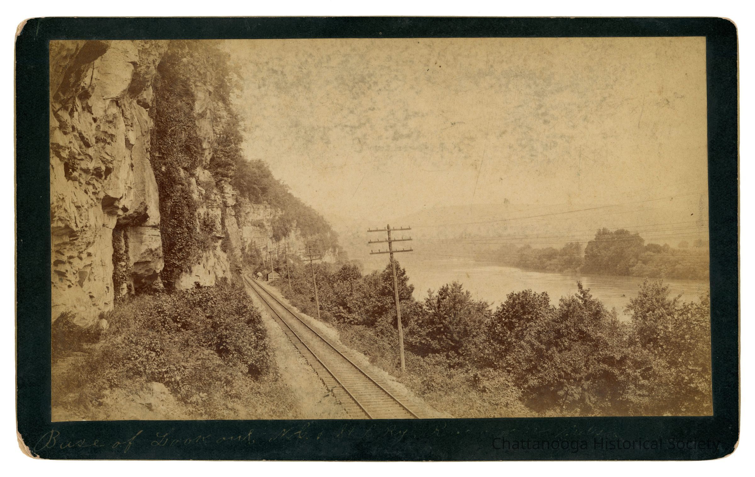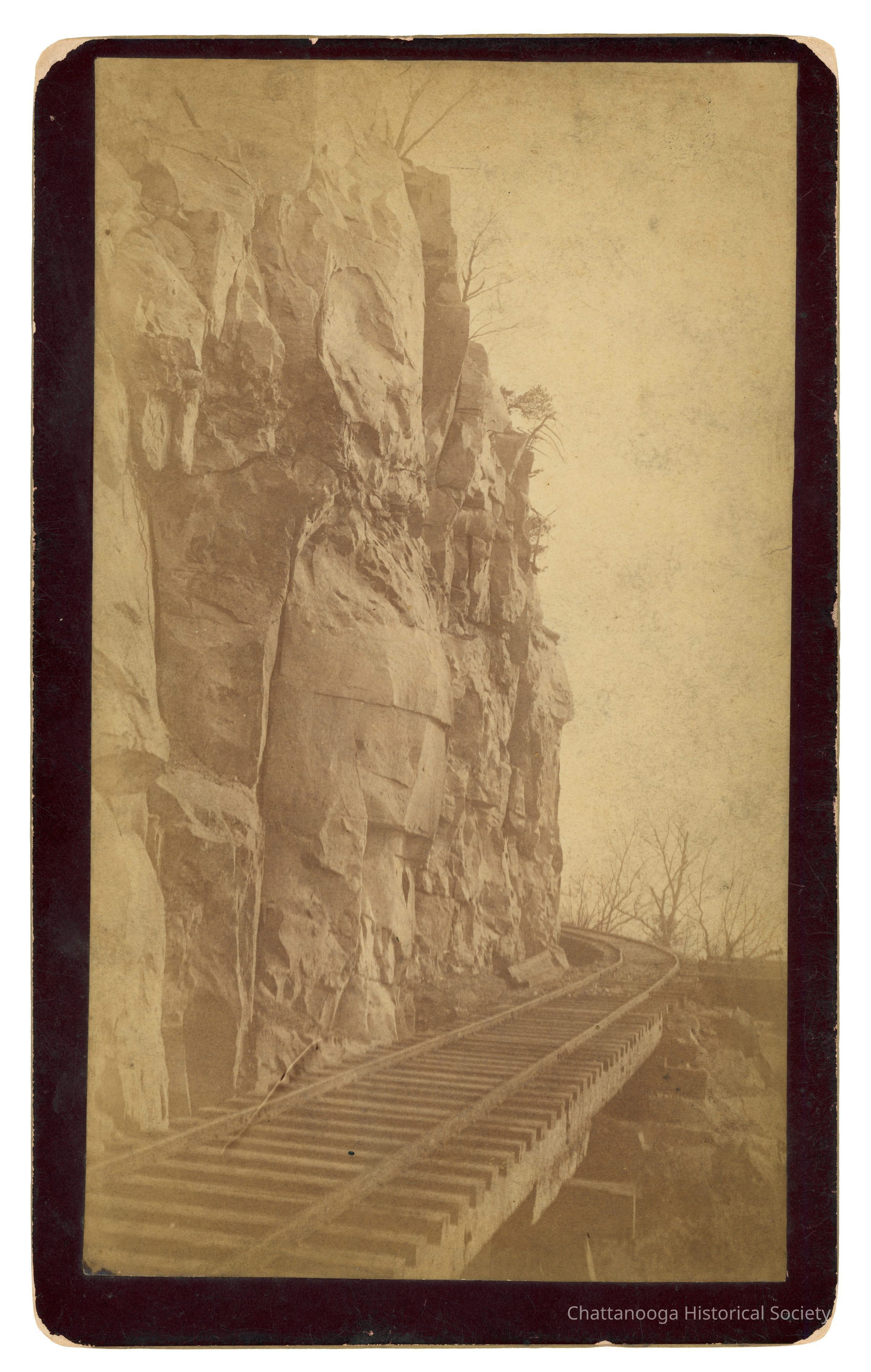 Cabinet Card photograph with gold beveled edge of the North Carolina & St. Louis Railroad Track at the base of Lookout Mountain. The back is printed "J.B. Linn & Co., Point Lookout, Lookout Mountain, Tennessee." There are two stickers on rear: one reads "Wendell C. Walker, 3209 Westonia Dr, East Ridge TN 37412" and the other "B27 Base of Lookout Mtn.-NC & St. L RR- 1890s"Creator