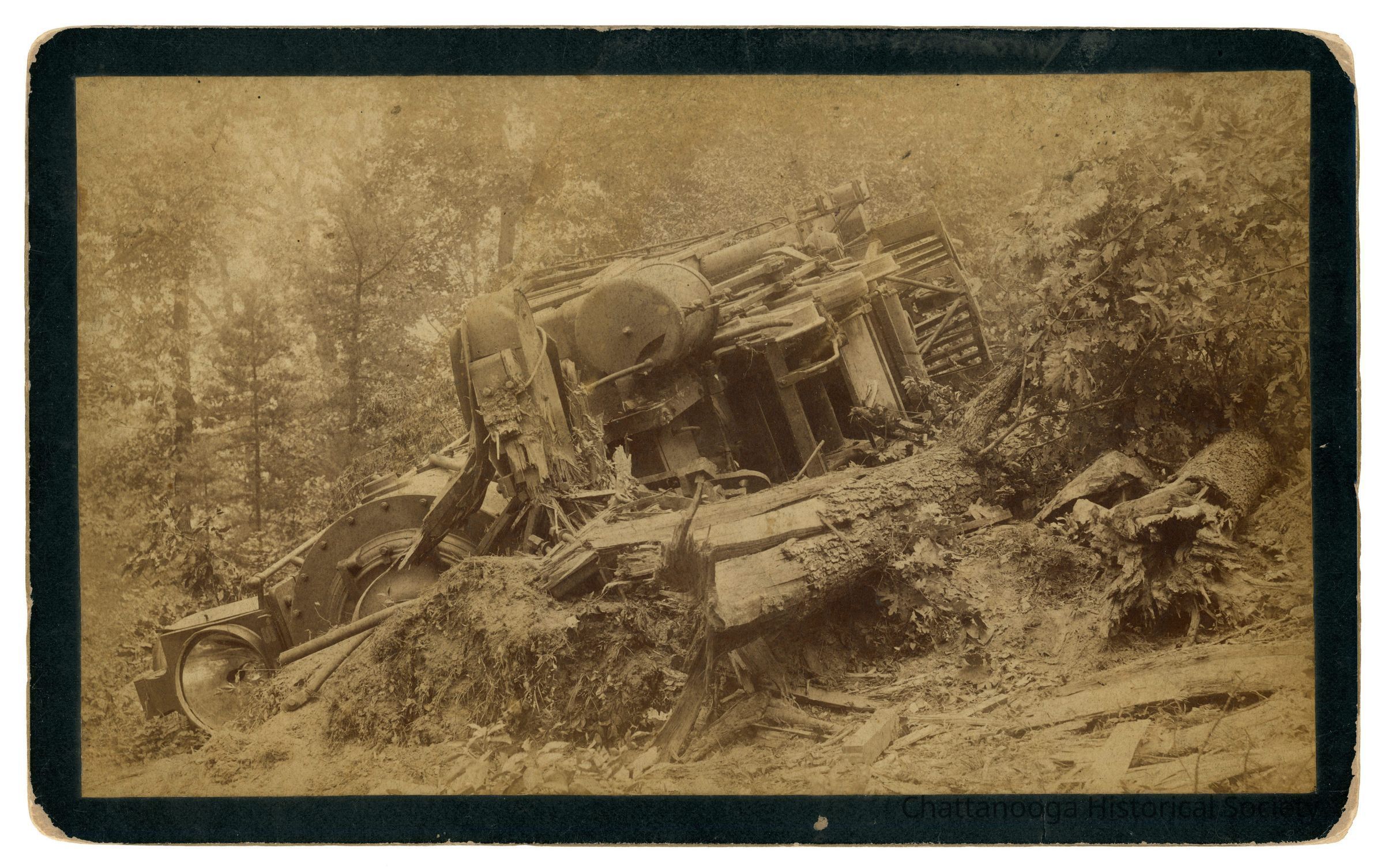 Cabinet Card photograph with gold beveled edge showing wreckage in a forested area. The back is printed "J.B. Linn, Sunset Rock, Lookout Mountain, Tennessee." There is a sticker on the rear that reads "Wendell C. Walker, 3209 Westonia Dr, East Ridge TN 37412" . On top of that is another sticker that reads "Train Wreck | Side of | Lookout Mtn. | 1890s"Creator