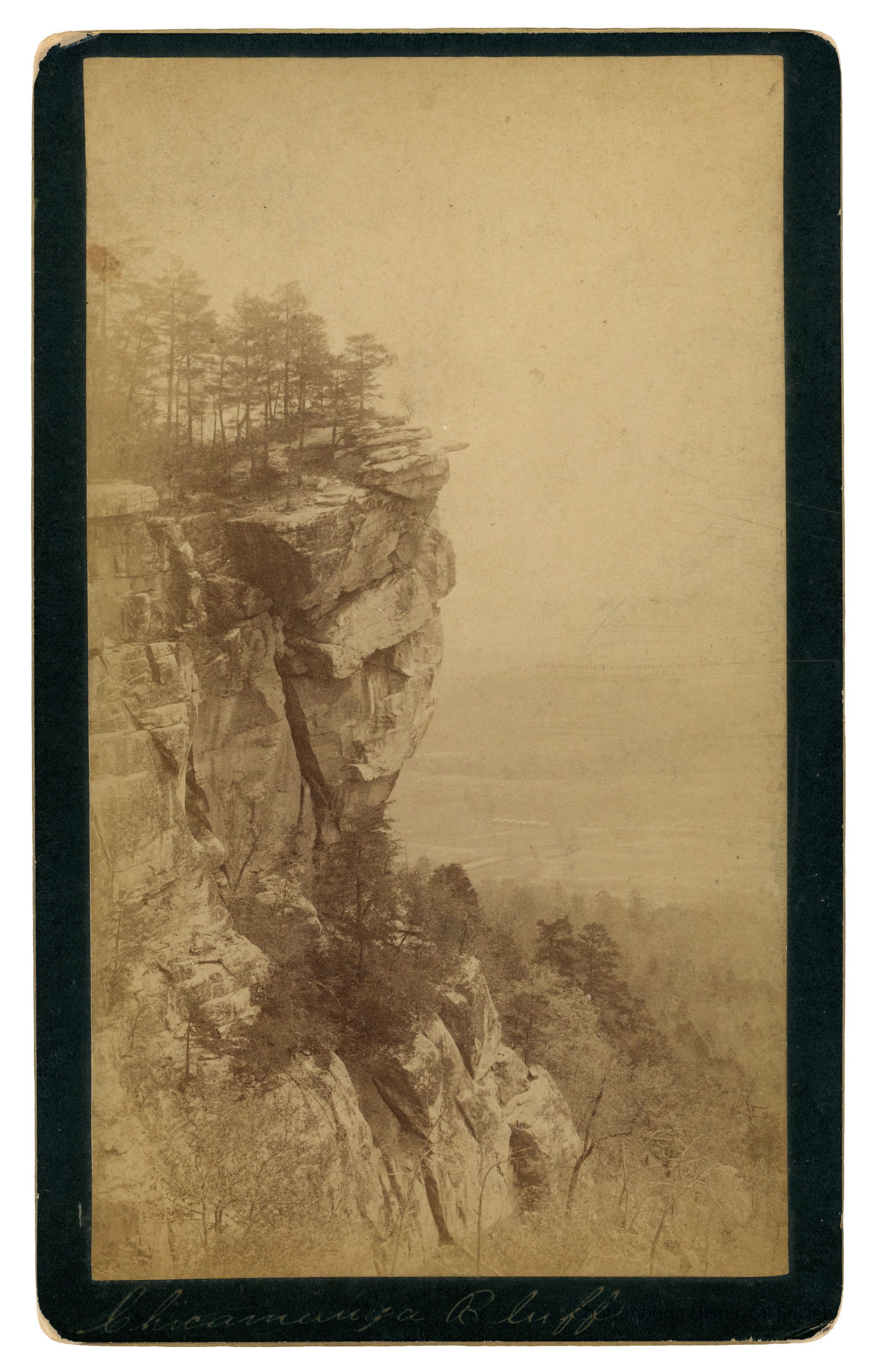 Black and white cabinet card photograph showing the Chickamauga Bluff on Lookout Mountain, Tennessee. The Tennessee River can be seen in the background. Printed on the rear is "S.S. Eaton & Co., Point Lookout Gallery, Lookout Mountain, Tenn." There are also two stickers, one that reads "Wendell C. Walker, 3209 Westonia Dr, East Ridge TN 37412" and another on that that reads "B27 | Chickamauga | Bluff | Lookout MTN | 1890's"Creator