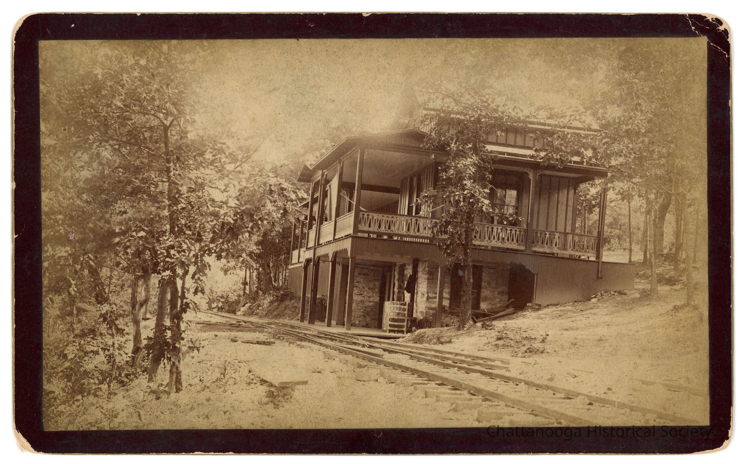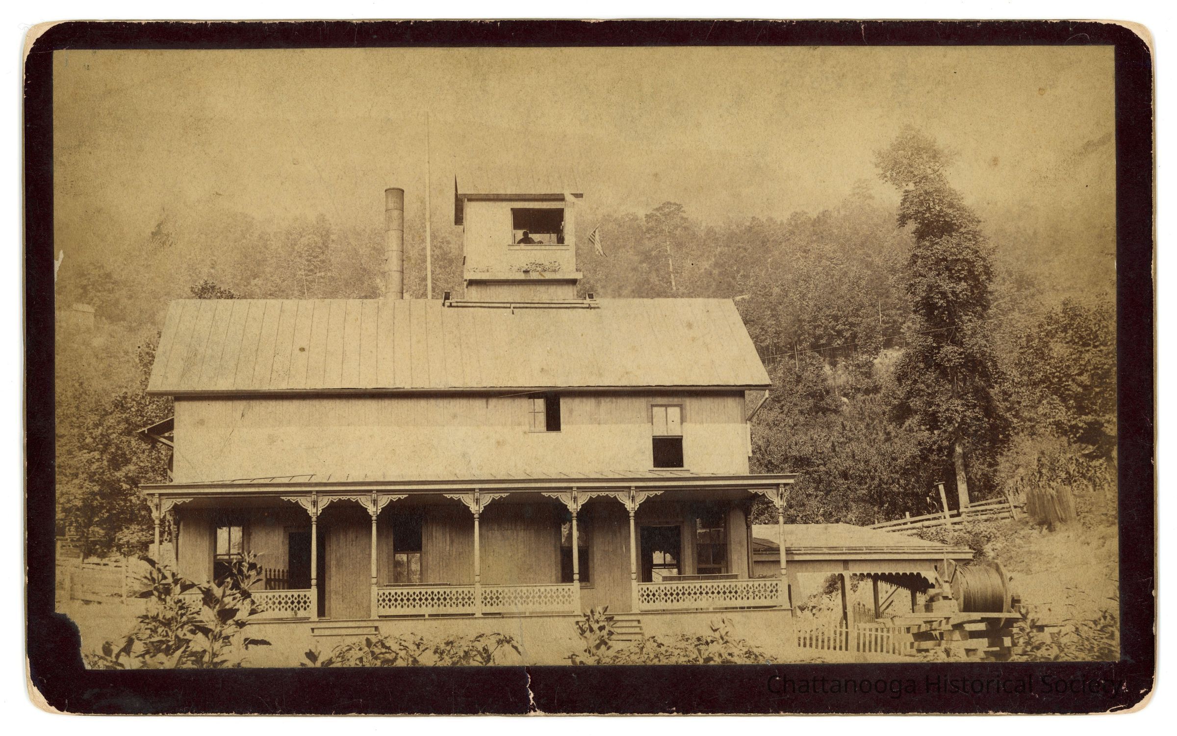 Black and white cabinet card photograph showing the base station of Incline Number 1. The station, a Folk Victorian style building with a cupola for the operator to view the train and tracks. The back is printed "J.B. Linn, POINT LOOKOUT, Lookout Mountain, Tenn." and a sticker on the rear that reads "Wendell C. Walker, 3209 Westonia Dr, East Ridge TN 37412"Creator