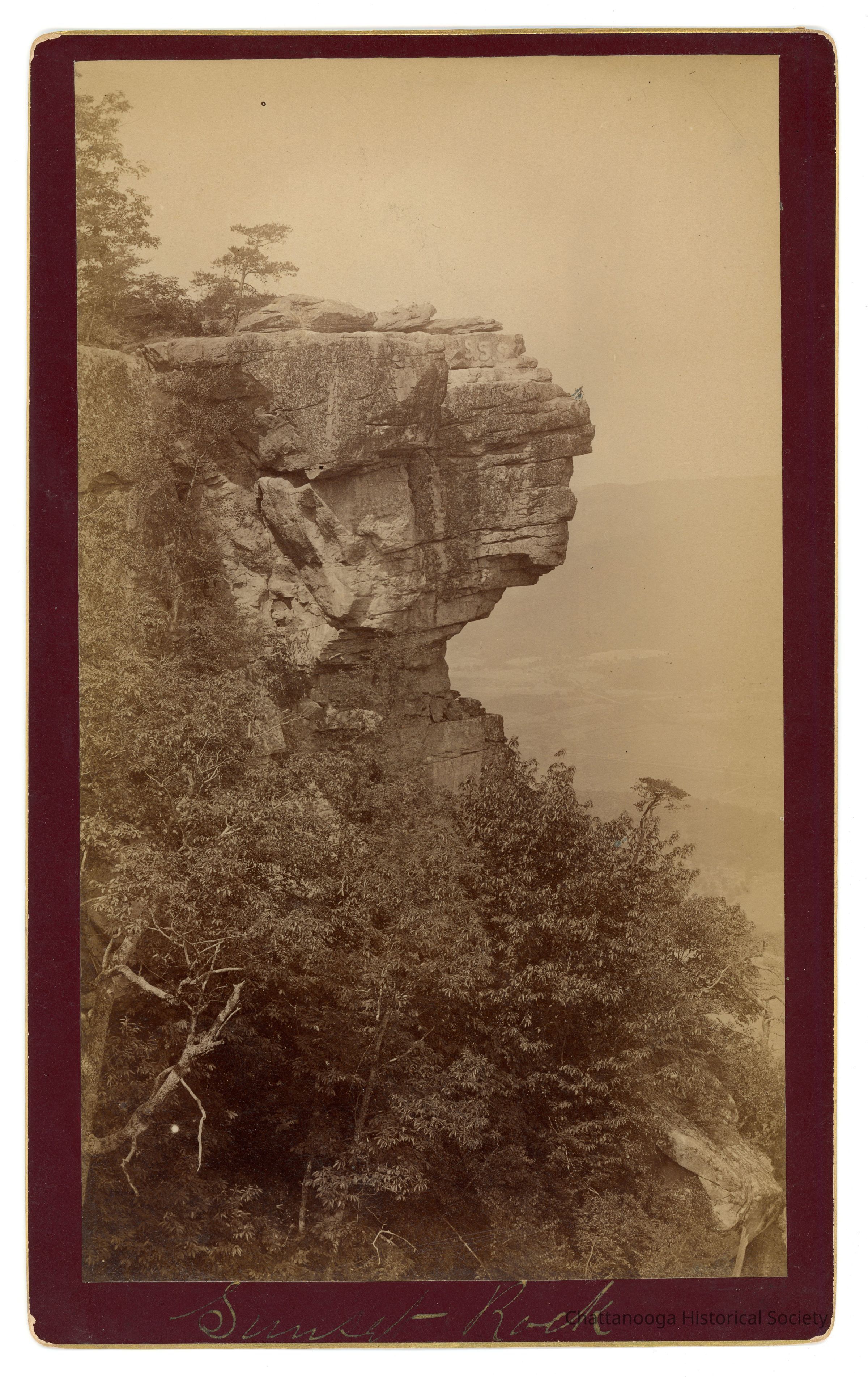 Black and white cabinet card photograph mounted on carding with gold beveled edge of the rock formation called Sunset Rock on Lookout Mountain, Tennessee. Written in the gutter of the card is "Sunset Rock". The back is printed "J.B. Linn, POINT LOOKOUT, Lookout Mountain, Tennessee."Creator