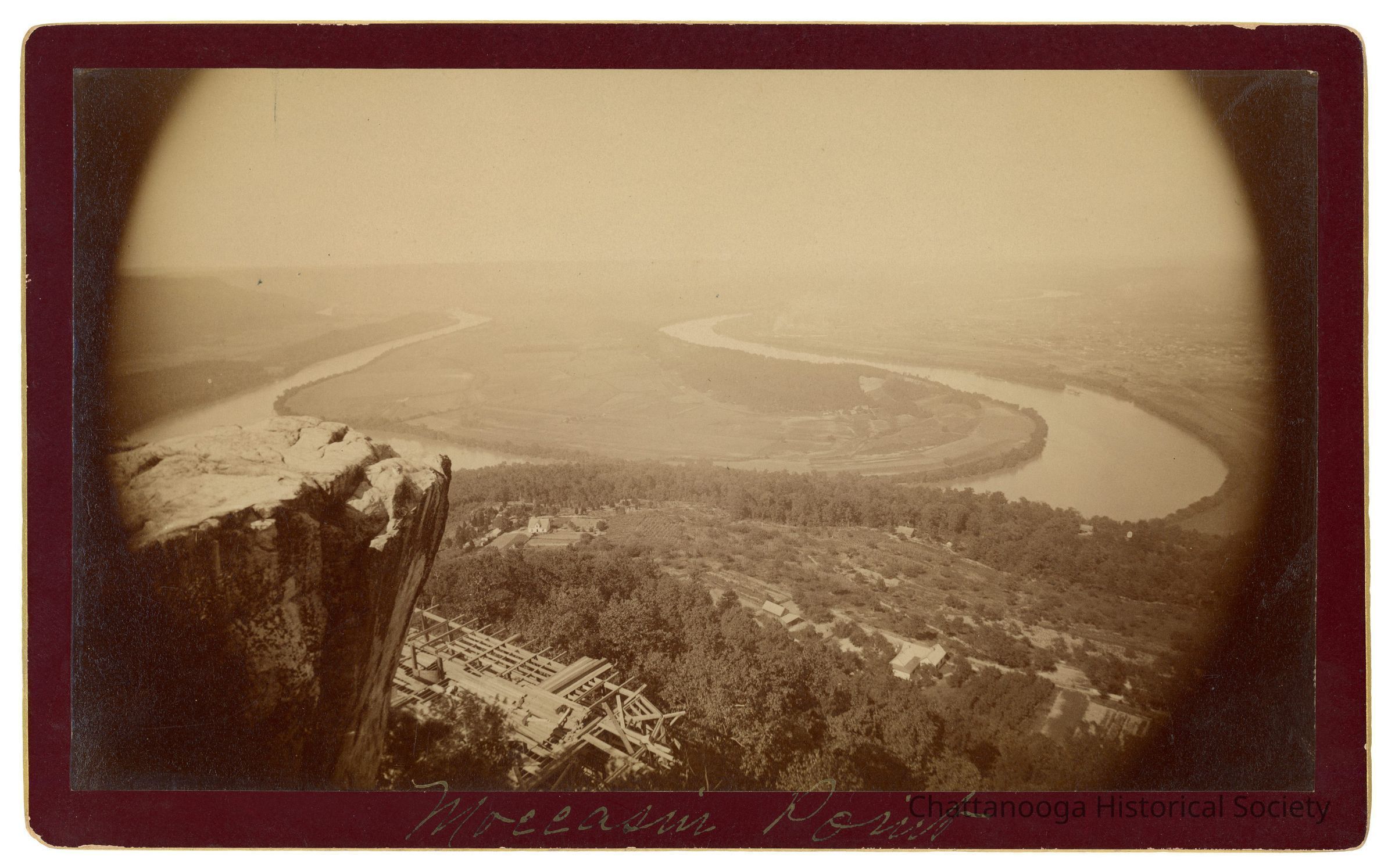 Black and white cabinet card photograph of the Point Hotel Construction with Moccasin Bend and the Tennessee River below. The wooden sill and framing of the Point Hotel is pictured below the rock formation of Point Lookout. The photograph is marked at the bottom gutter of the card "Moccasin Point". The back is printed "J.B. Linn, POINT LOOKOUT, Lookout Mountain, Tenn."Creator