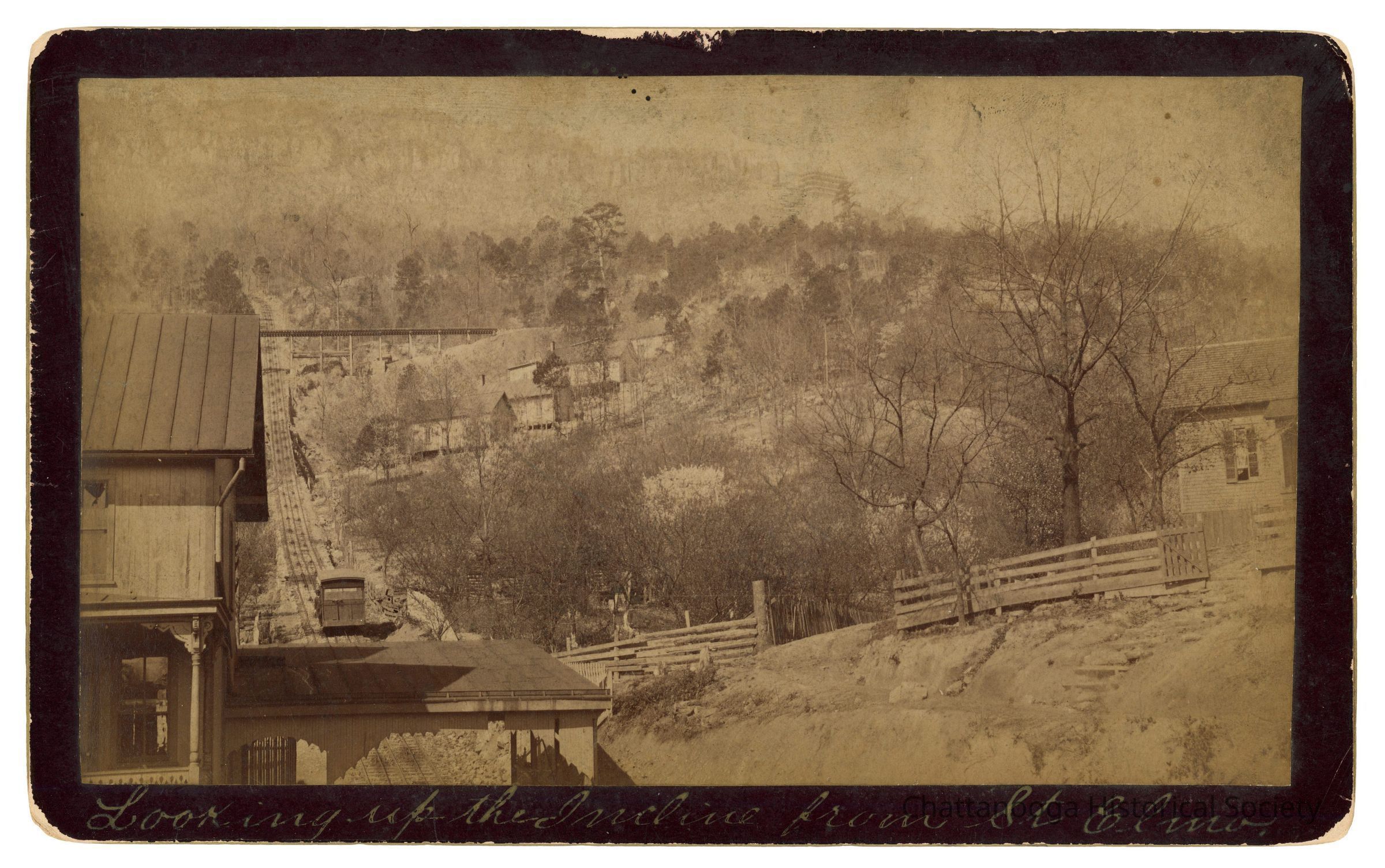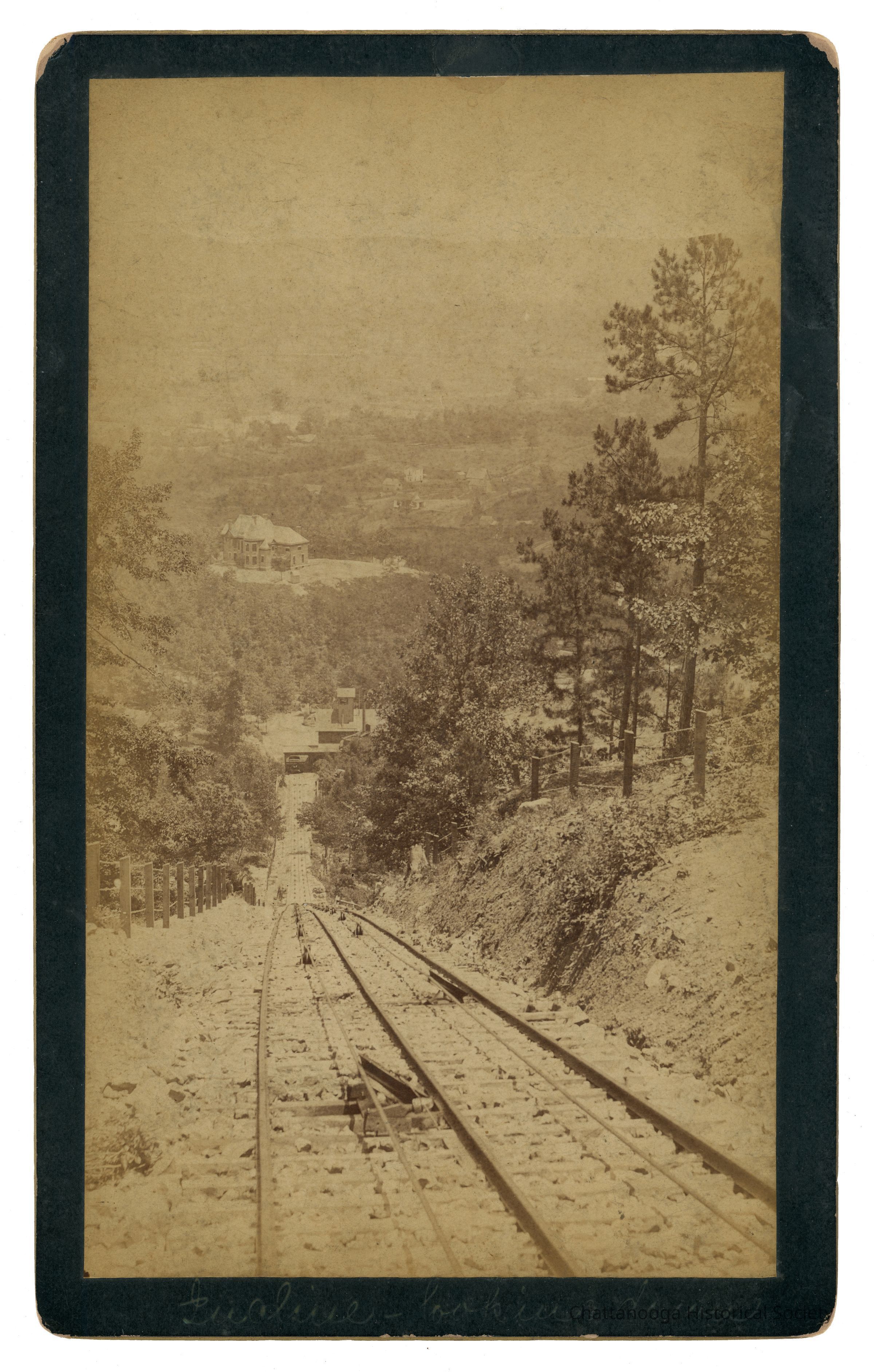 Cabinet Card photograph with gold beveled edge looking down the tracks of Incline Number 1 on Lookout Mountain, to the base. A mansion can be seen in the midground, on a rise opposite of the base station. The card is titled "Incline - Looking Down". The back in printed "J.B. Linn, & Co., Point Lookout, Lookout Mountain, Tennessee." There is a sticker on rear that reads "Wendell C. Walker, 3209 Westonia Dr, East Ridge TN 37412" .Creator