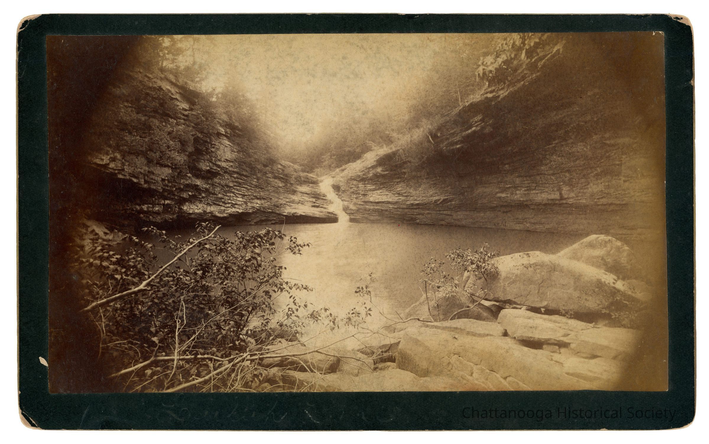 Cabinet Card photograph with gold beveled edge the base of the lower falls of Lula Lake. The back is printed "J.B. Linn & Co., Point Lookout, Lookout Mountain, Tennessee." There are two stickers on rear: one reads "Wendell C. Walker, 3209 Westonia Dr, East Ridge TN 37412" and the other "B27 LULAH LAKE - Lookout MTN 1890's"Creator
