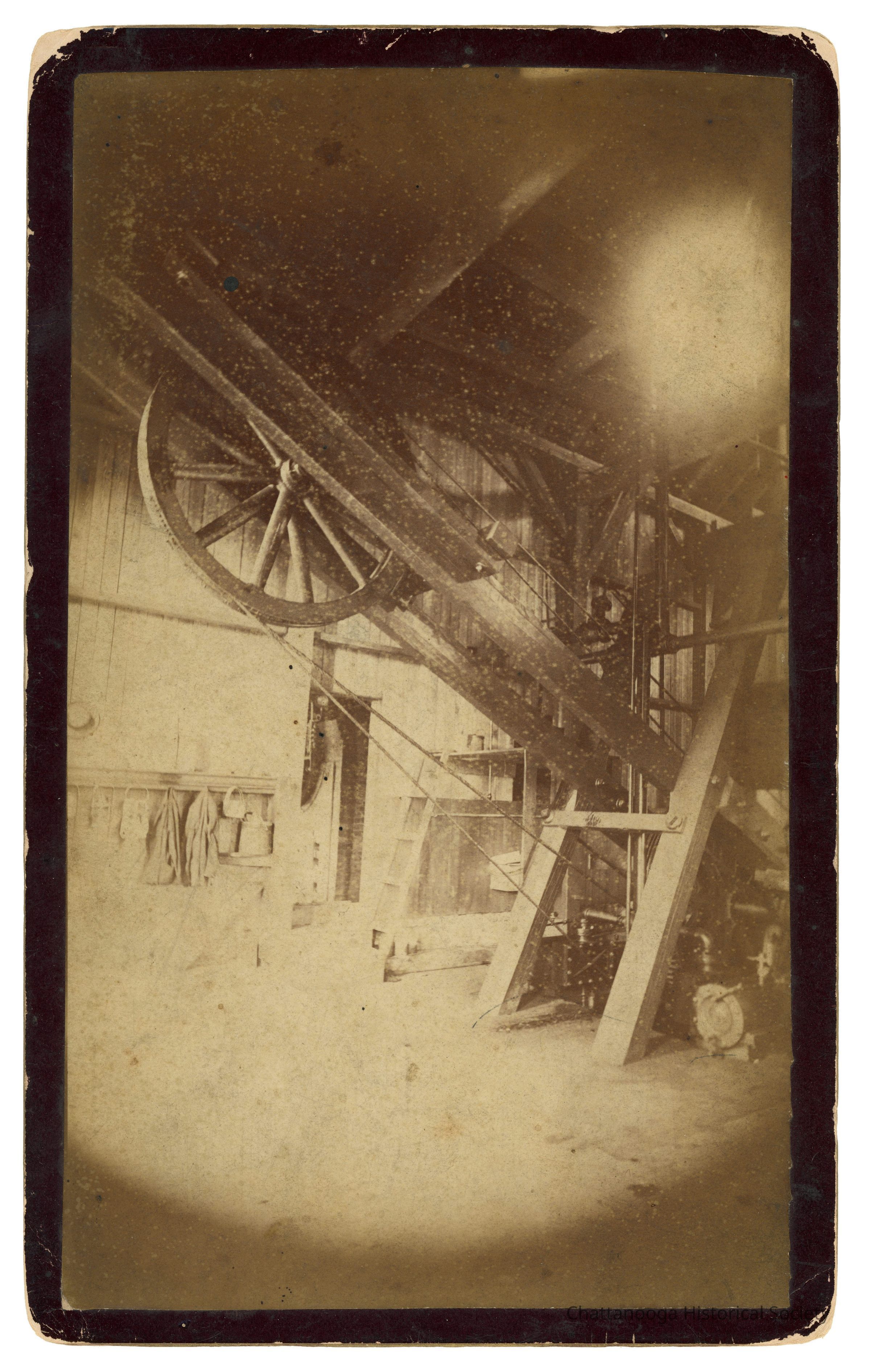Black and white cabinet card photograph of the pulley and haulage cable used to move the Incline Railroad (Number 1) up and down Lookout Mountain, Tennessee. The back is printed "J.B. Linn, POINT LOOKOUT, Lookout Mountain, Tenn." and a sticker on the rear that reads "Wendell C. Walker, 3209 Westonia Dr, East Ridge TN 37412"Creator