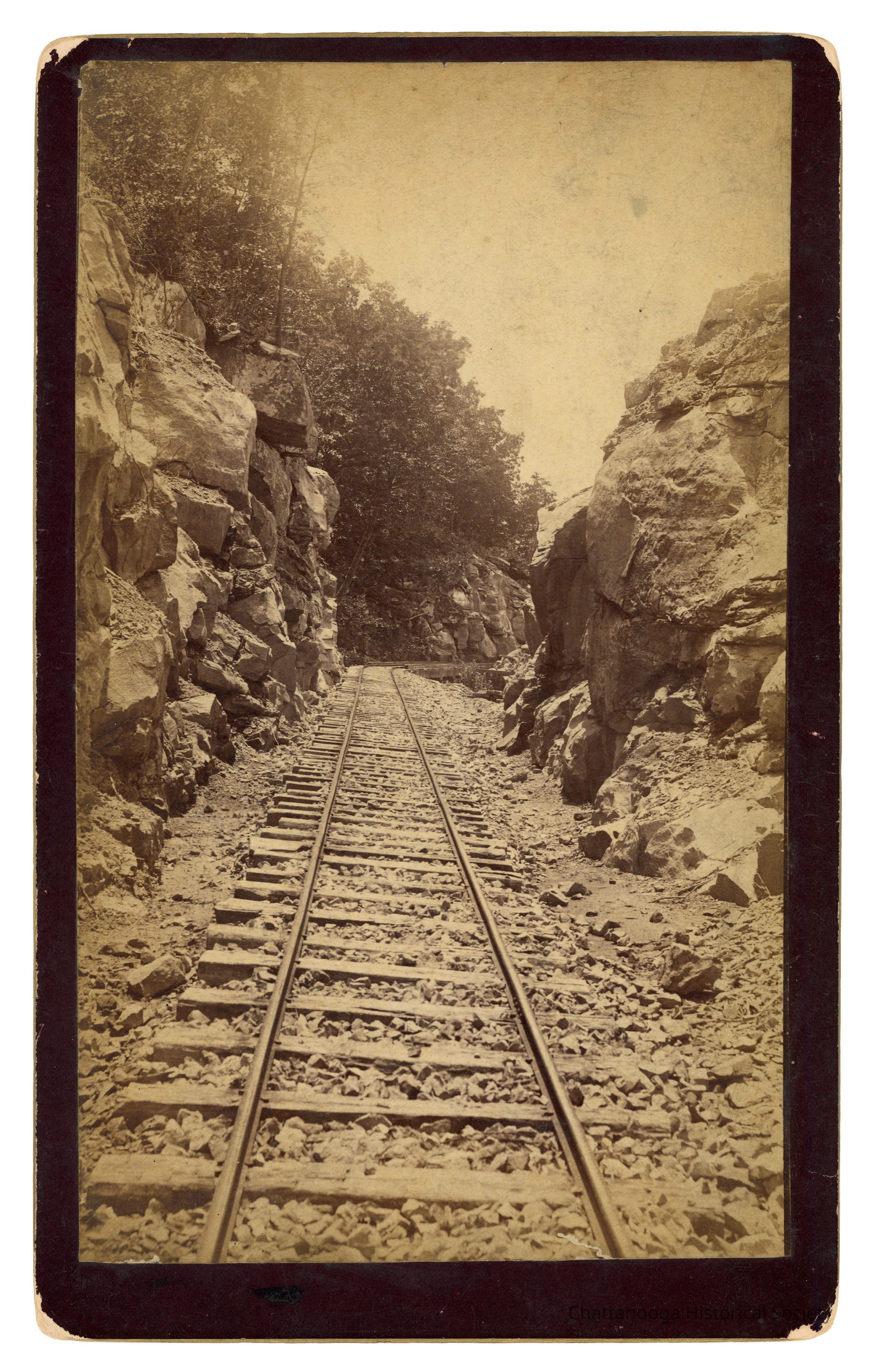 Cabinet Card photograph with gold beveled edge showing the tracks of the Narrow Guage Railroad tracks in between two rock formations. The back is printed "J.B. Linn, POINT LOOKOUT, Lookout Mountain, Tennessee." Above the printing is a sticker on the rear that reads "Wendell C. Walker, 3209 Westonia Dr, East Ridge TN 37412" . Below the printing that is another sticker that reads "Narrow Guage | R.R. - LKT.MTN. | From Point | Rock to | Sunset Rock"Creator