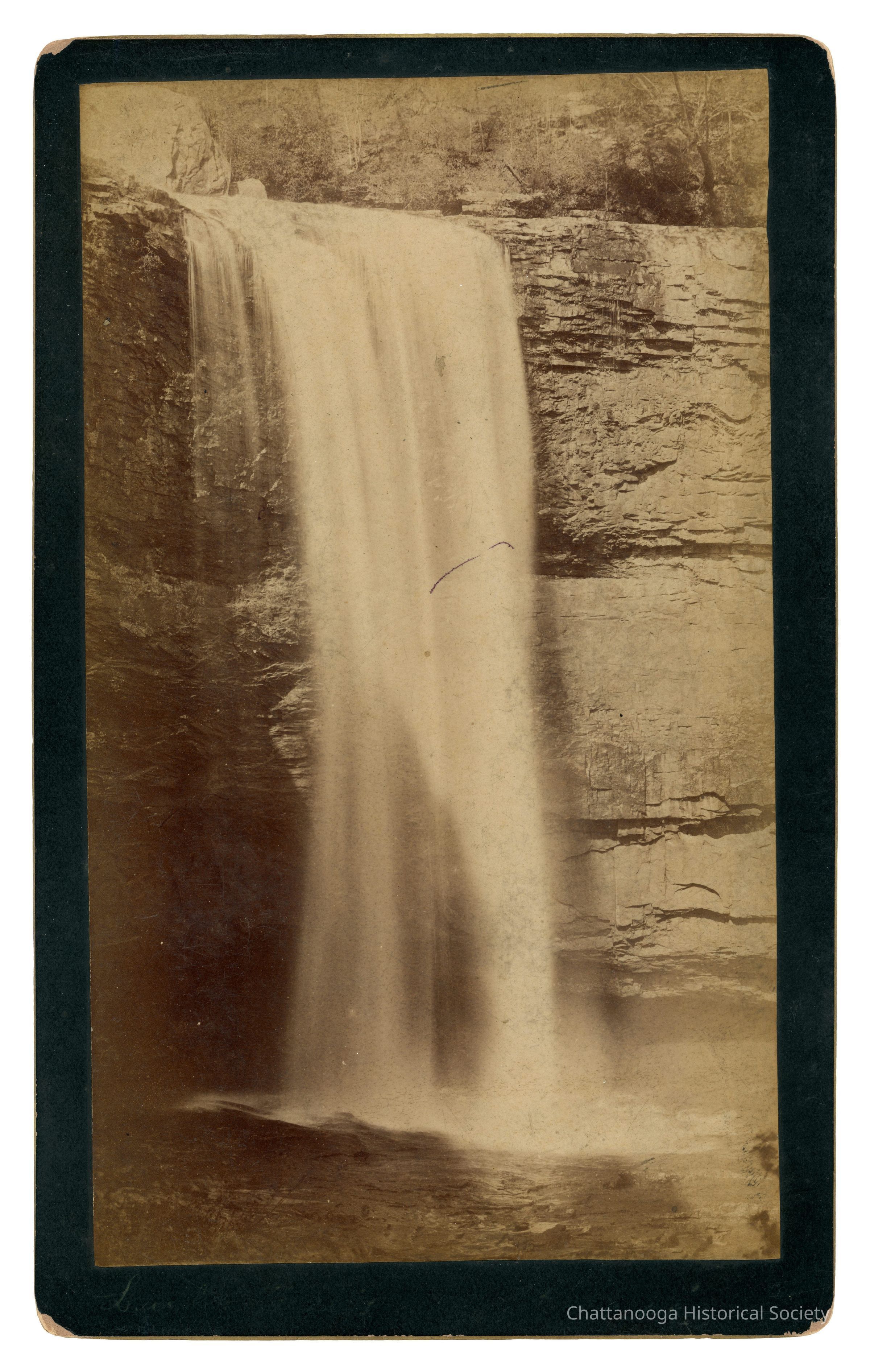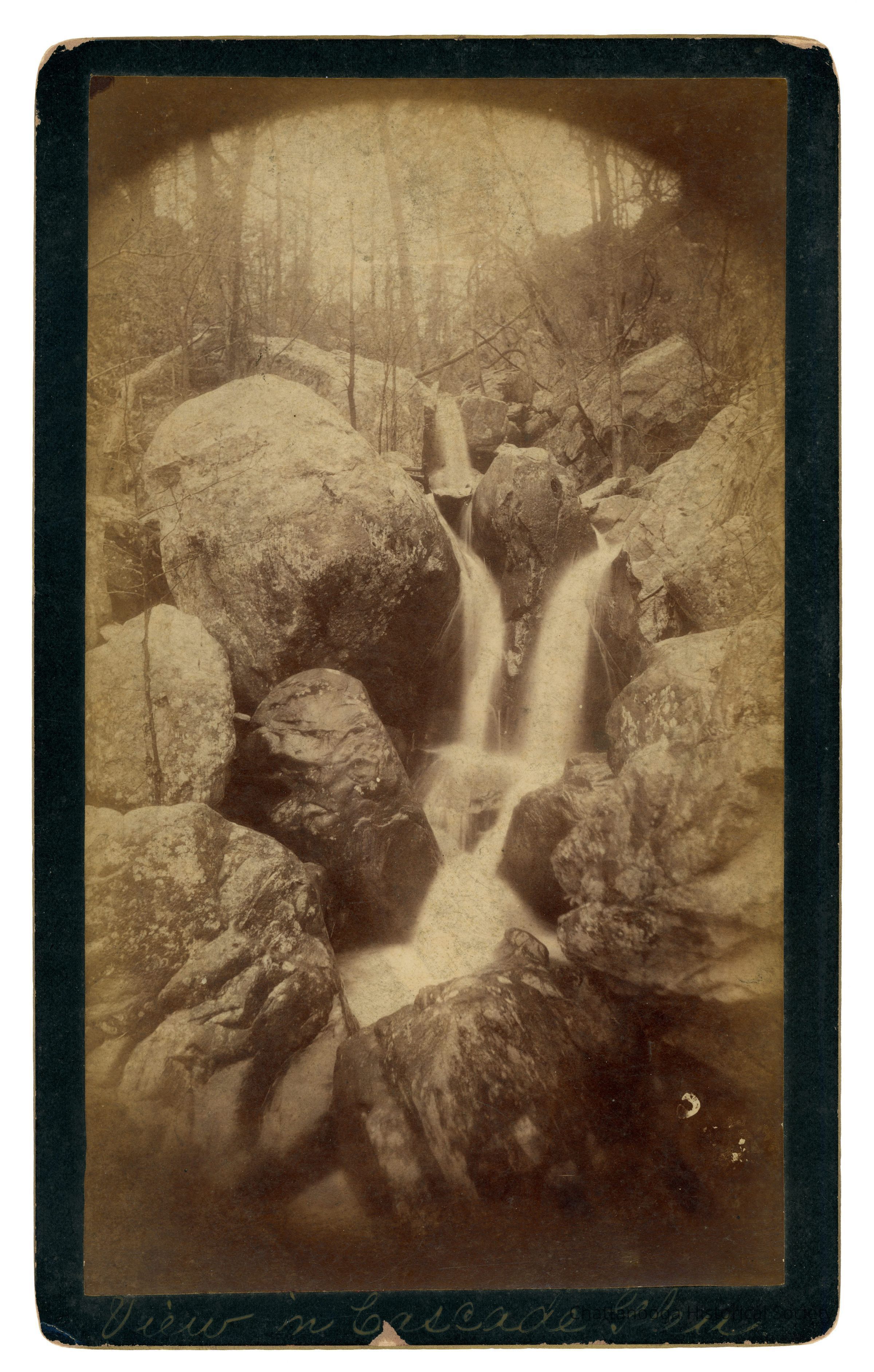 Black and white cabinet card photograph showing a waterfall on Lookout Mountain. "View of Cascade Glenn" is written in the bottom of the butter of the card. "J.B. Linn & Co., POINT LOOKOUT, Lookout Mountain, Tennessee." is printed on the rear. There are also two stickers, one that reads "Wendell C. Walker, 3209 Westonia Dr, East Ridge TN 37412" and another on that that reads "B27 | View in | Cascade | Glen | Lookout MTN | 1890s".Creator