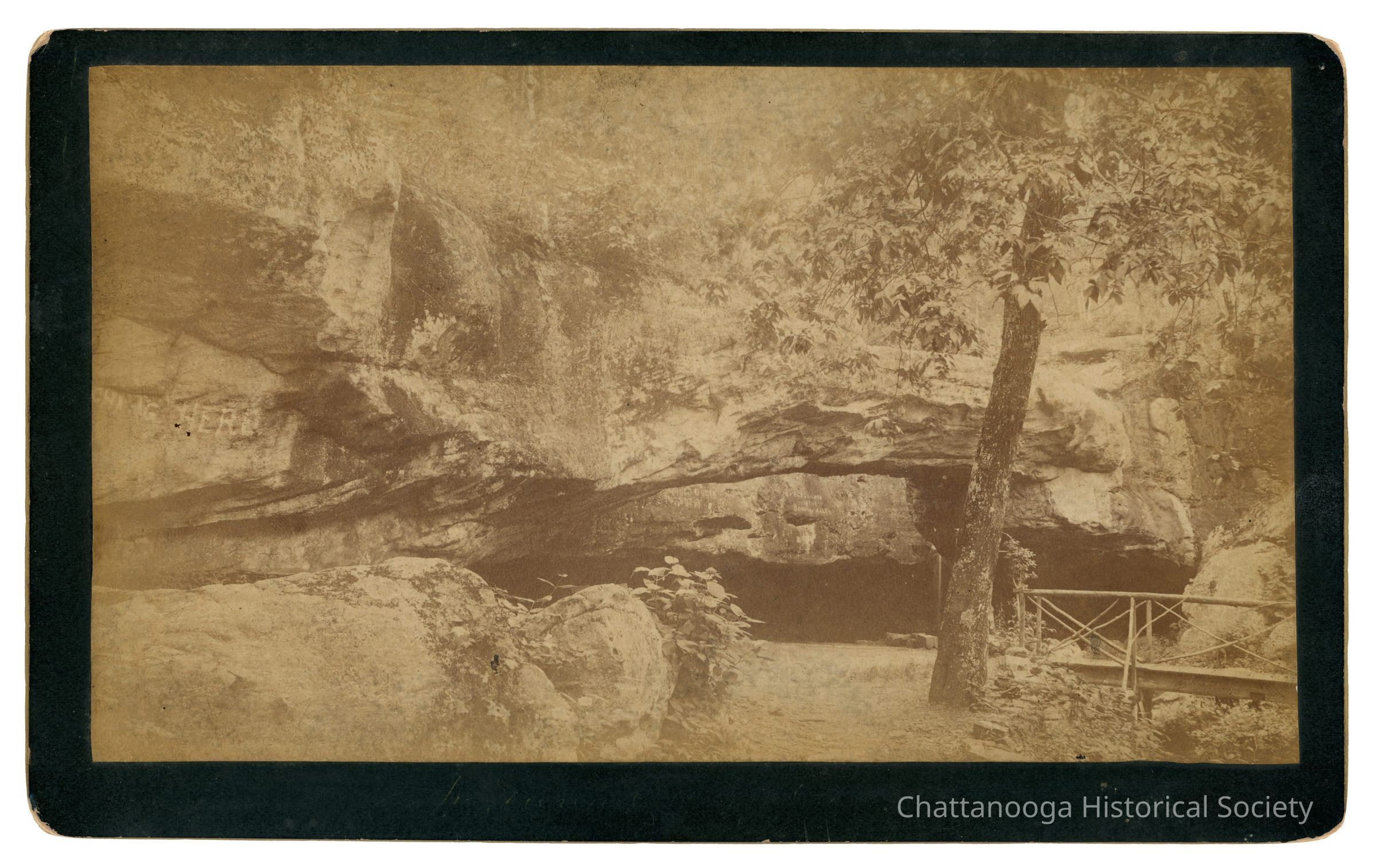 Cabinet Card photograph with gold beveled edge of the Natural Bridge rock formation on Lookout Mountain. The back is printed "J.B. Linn & Co, Point Lookout, Lookout Mountain, Tennessee." There are two stickers on rear: one reads "Wendell C. Walker, 3209 Westonia Dr, East Ridge TN 37412" and the other "B27 NATURAL Bridge on Lookout MTN.- 1890s"Creator