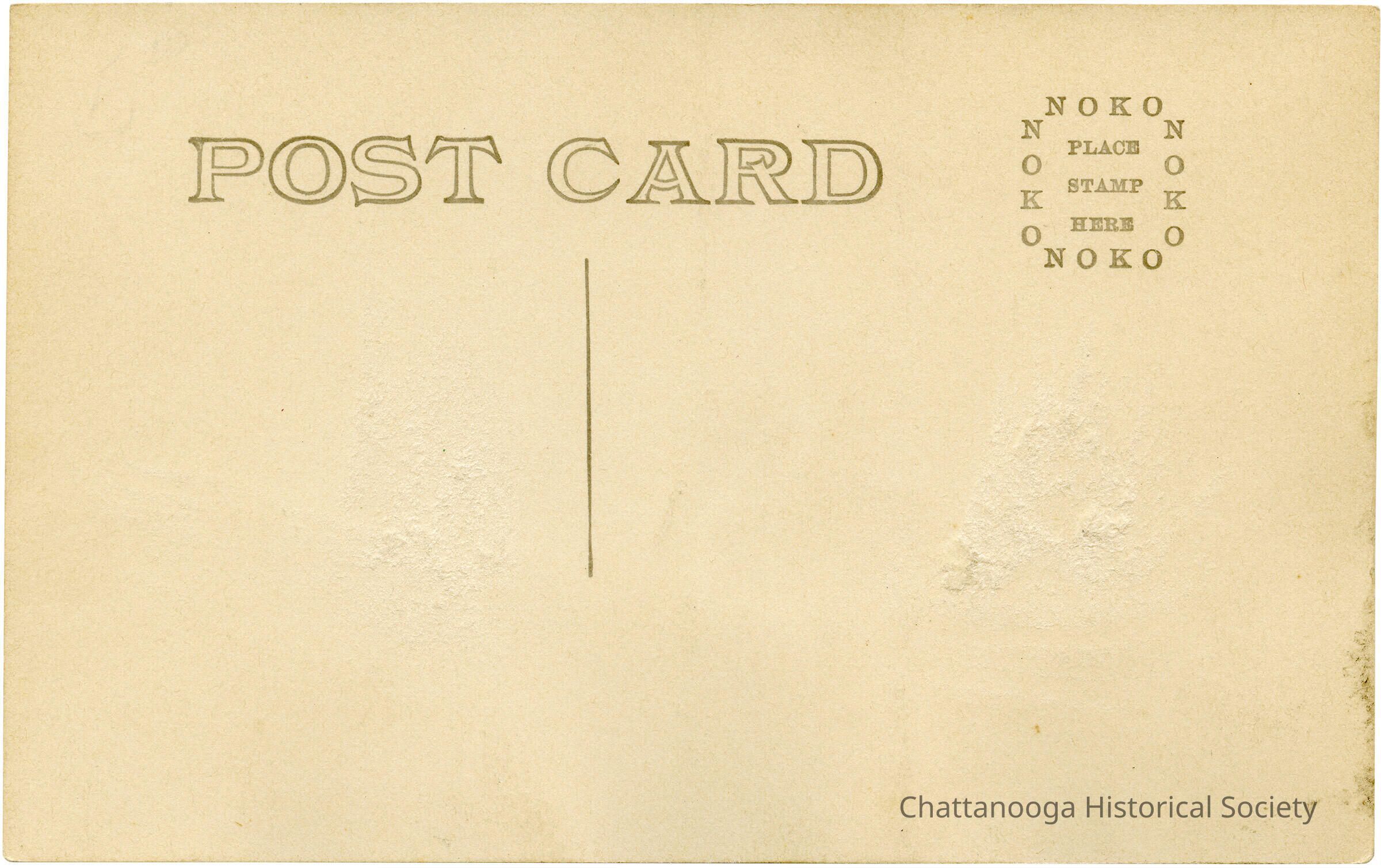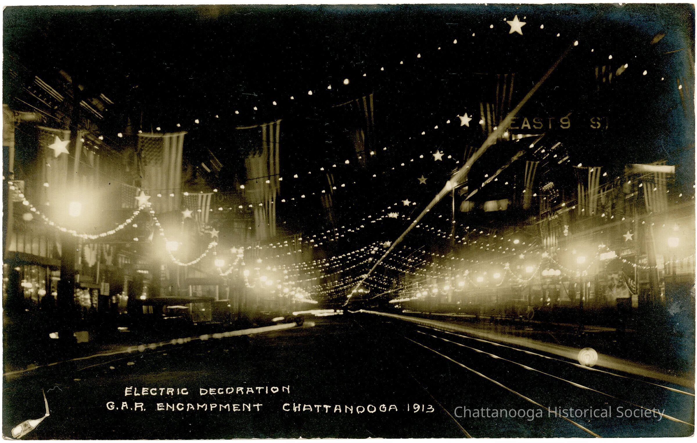 A gelatin-silver printed postcard with the front showing a photograph of the "electric decoration" of Market Street at E. 9th Street (MLK Blvd.) during the 1913 Grand Army of the Republic (G.A.R.) Encampment in Chattanooga, Tennessee. The decoration includes American Glage and string lights hanging across the street.Subject Person/Organization