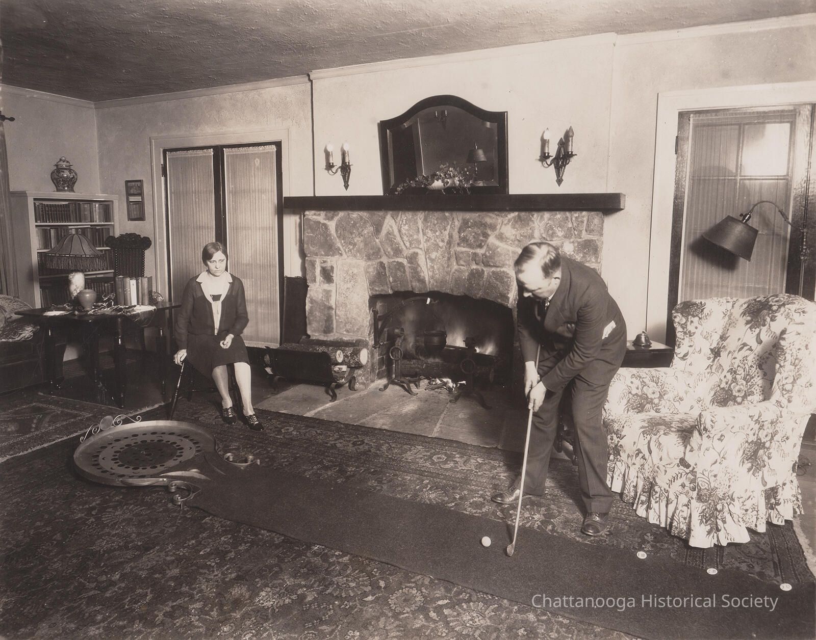 Black and white photograph of Garnet Carter teeing up to play mini golf on an indoor putting green. The green consists of a darker strip of carpet leading up to a metal dish with holes that appears to show a point system depending on where the ball lands. Frieda is sitting above the disc in a wooden chair, watching Garnet putt. The living room consists of a large masonry fireplace with a large rug in front and a mirror on the mantle. There is a bookcase at the far left corner with a desk and high back chair in front. The fireplace is flanked by two French doors.