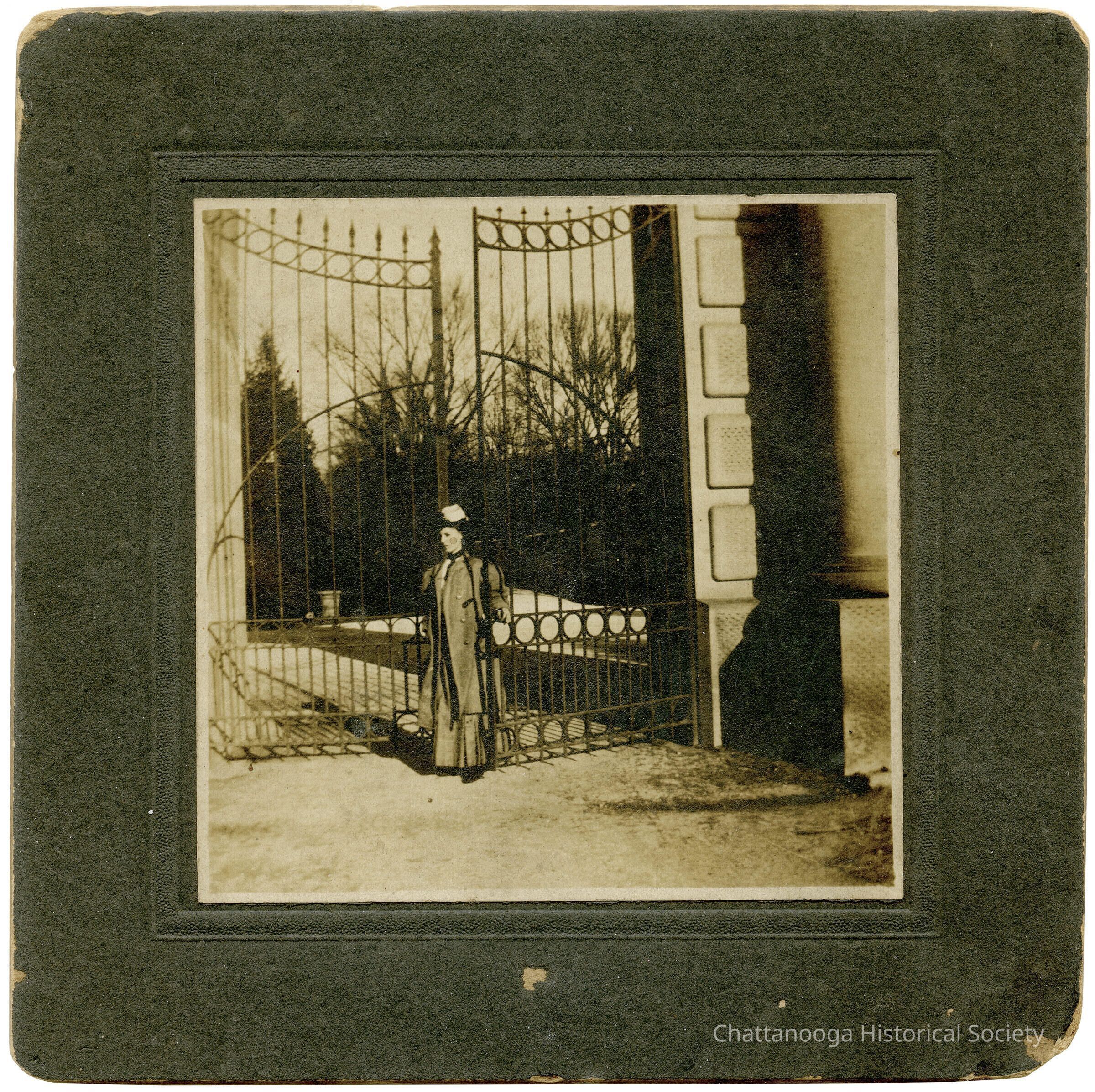 A photograph mounted on a card showing a woman in the open gate of the Chattanooga National Cemetery.Photograph Details