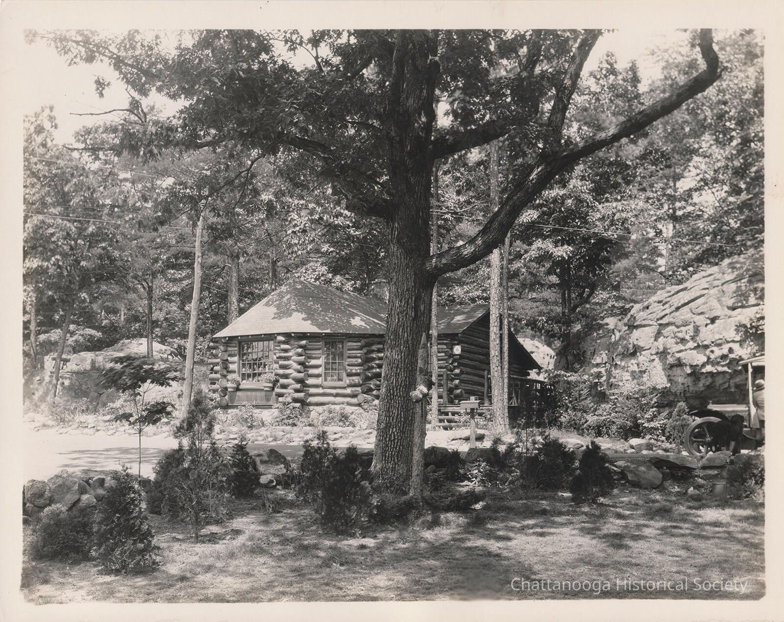 Black and white photograph of Hansel and Gretel's Gingerbread House, a wood cabin styled dwelling associated with the Tom Thumb Golf Course that was a part of the Fairyland Inn, Lookout Mountain, Georgia. The cabin has an octagonal projection, with a large 6x4 window facing the drive. There is a large sign underneath the window that reads "Hansel & Gretel's Gingerbread House". Portions of the golf course can be seen in the left, background.Photograph Details