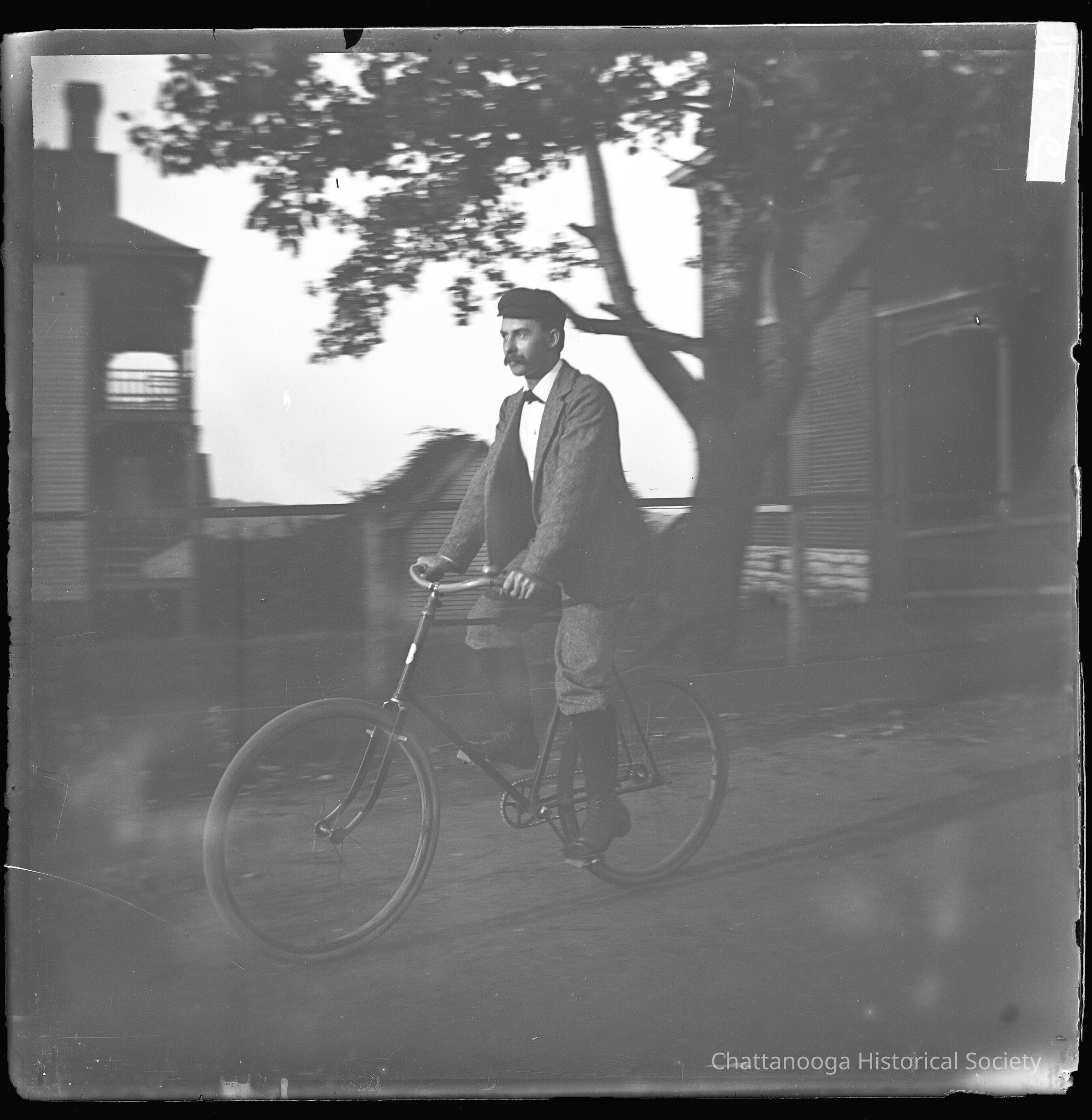 Image taken from the glass plate negative showing a young mustachioed man on a bicycle riding down a dirt road. The man is wearing a wool jacket with knickerbockers as well as a dark cap. The two wheeled bicycle has a bell and a metal tag on the head tube.