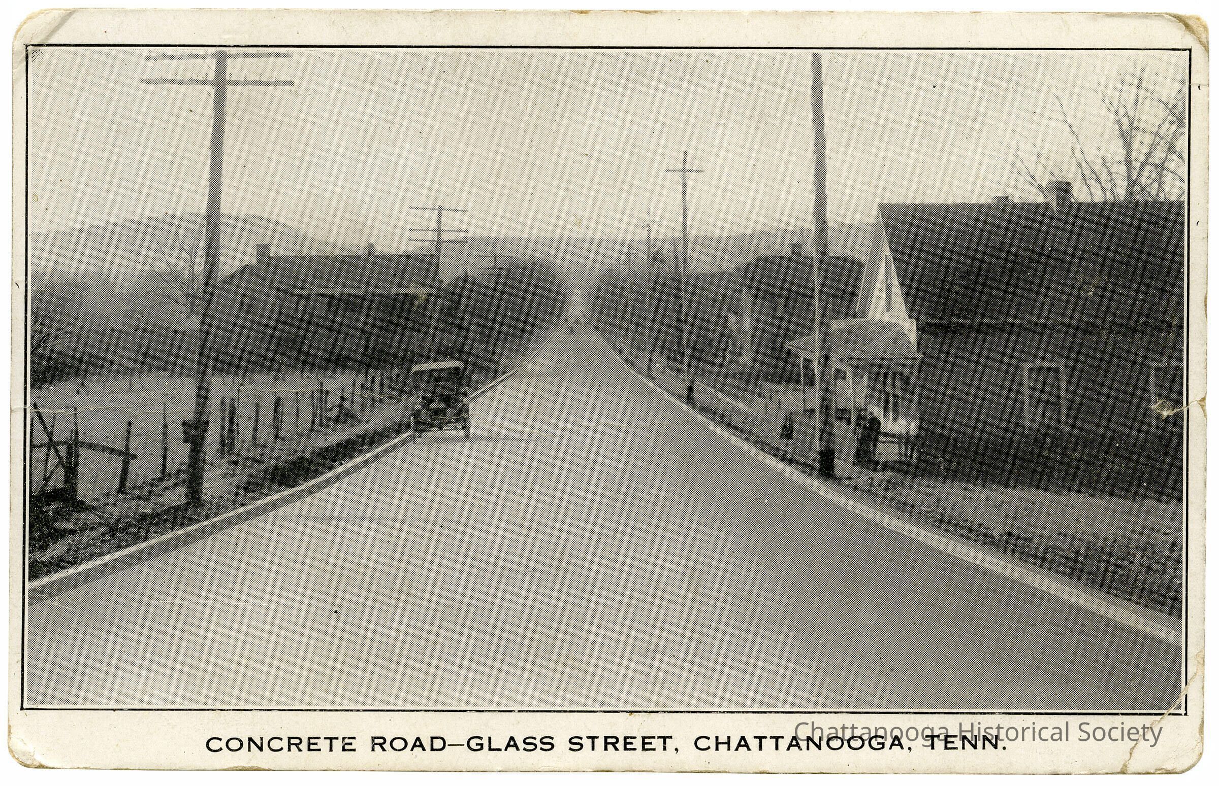 A black and white postcard with the front showing a photograph of Glass Street (a concrete road) from Campbell Street in East Chattanooga, Tennessee.Subject Place