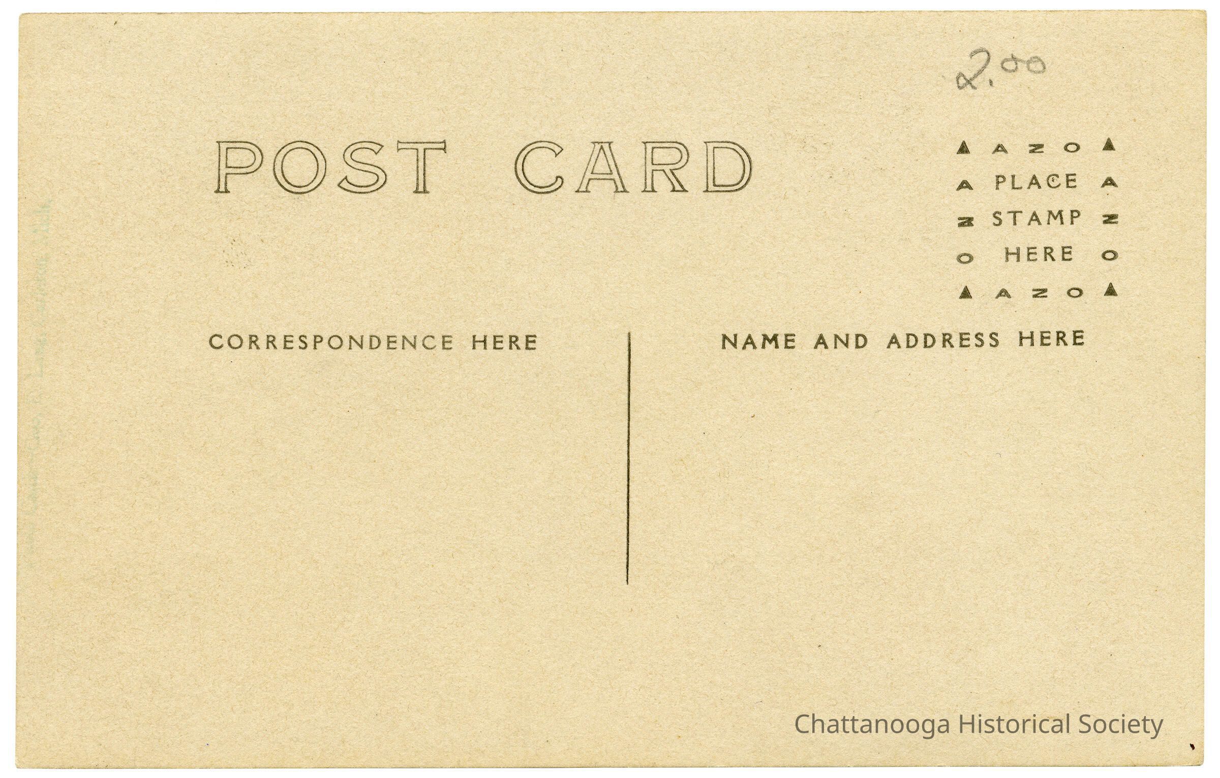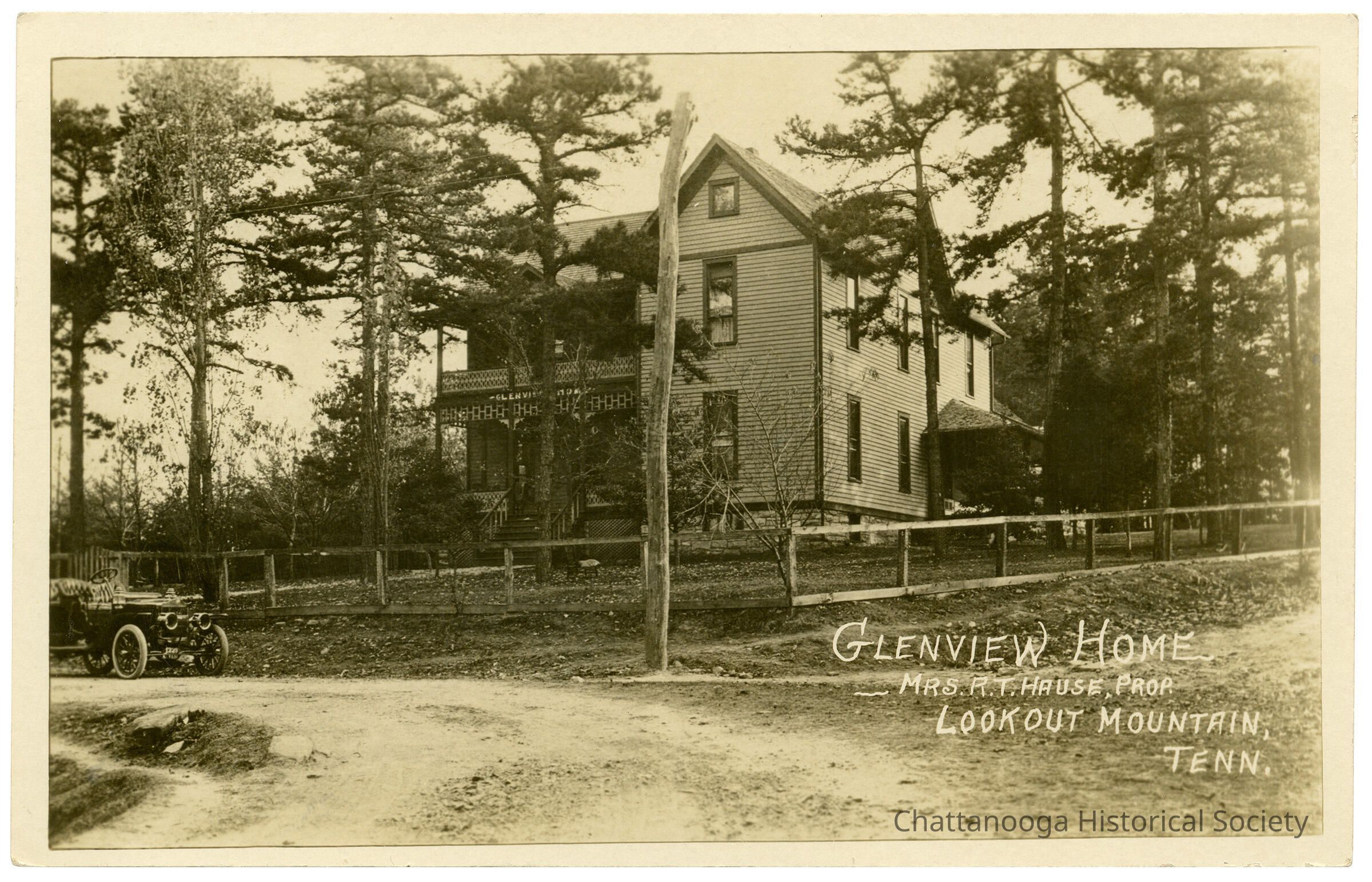 A postcard with the front advertising Glenview Home on Lookout Mountain located at 122 E. West Road in Lookout Mountain, Tennessee.