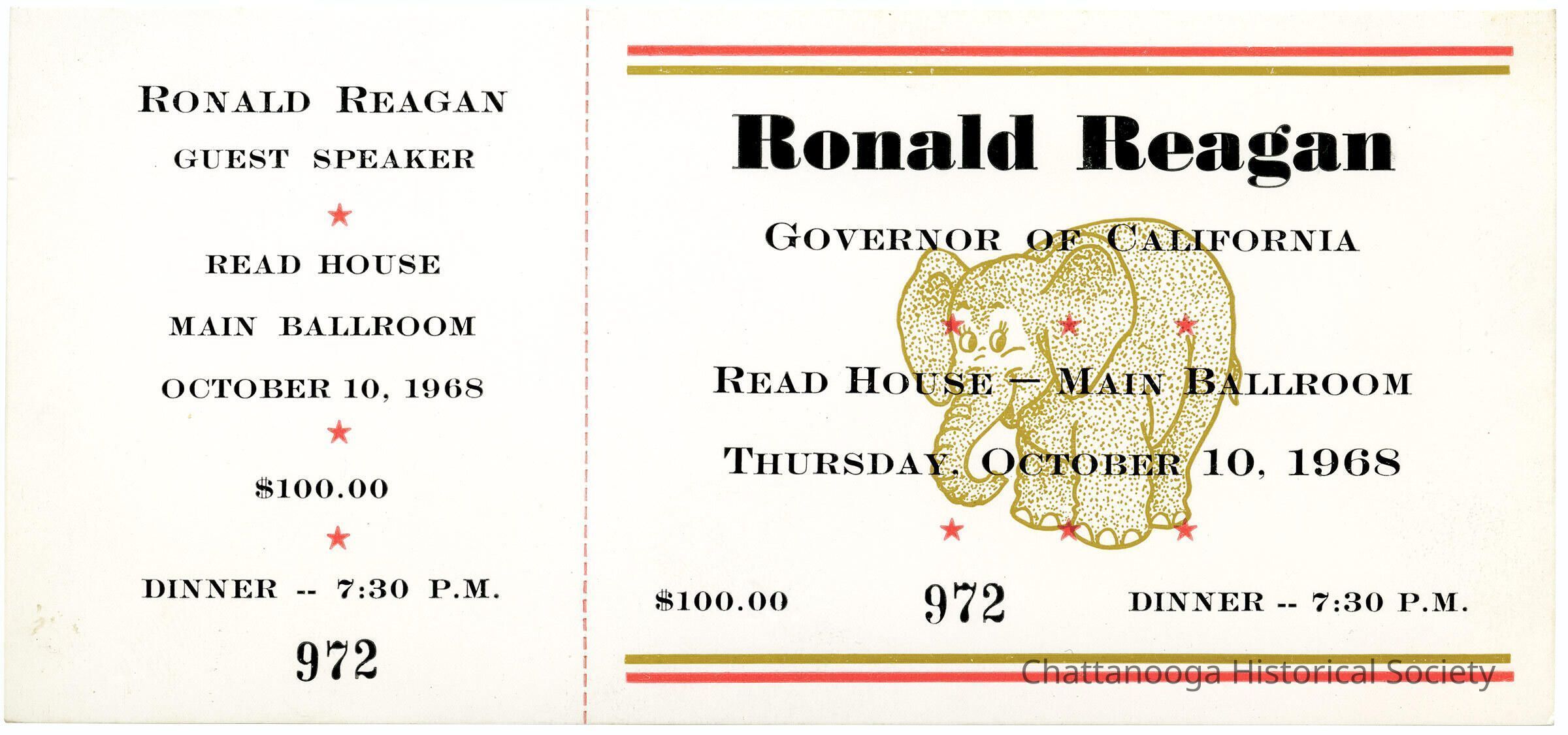 A ticket for a dinner with guest speaker Gov. Ronald Reagan of California in the Read House's Main Ballroom in 1968. The ticket features a detachable stub which reads "Ronald Reagan