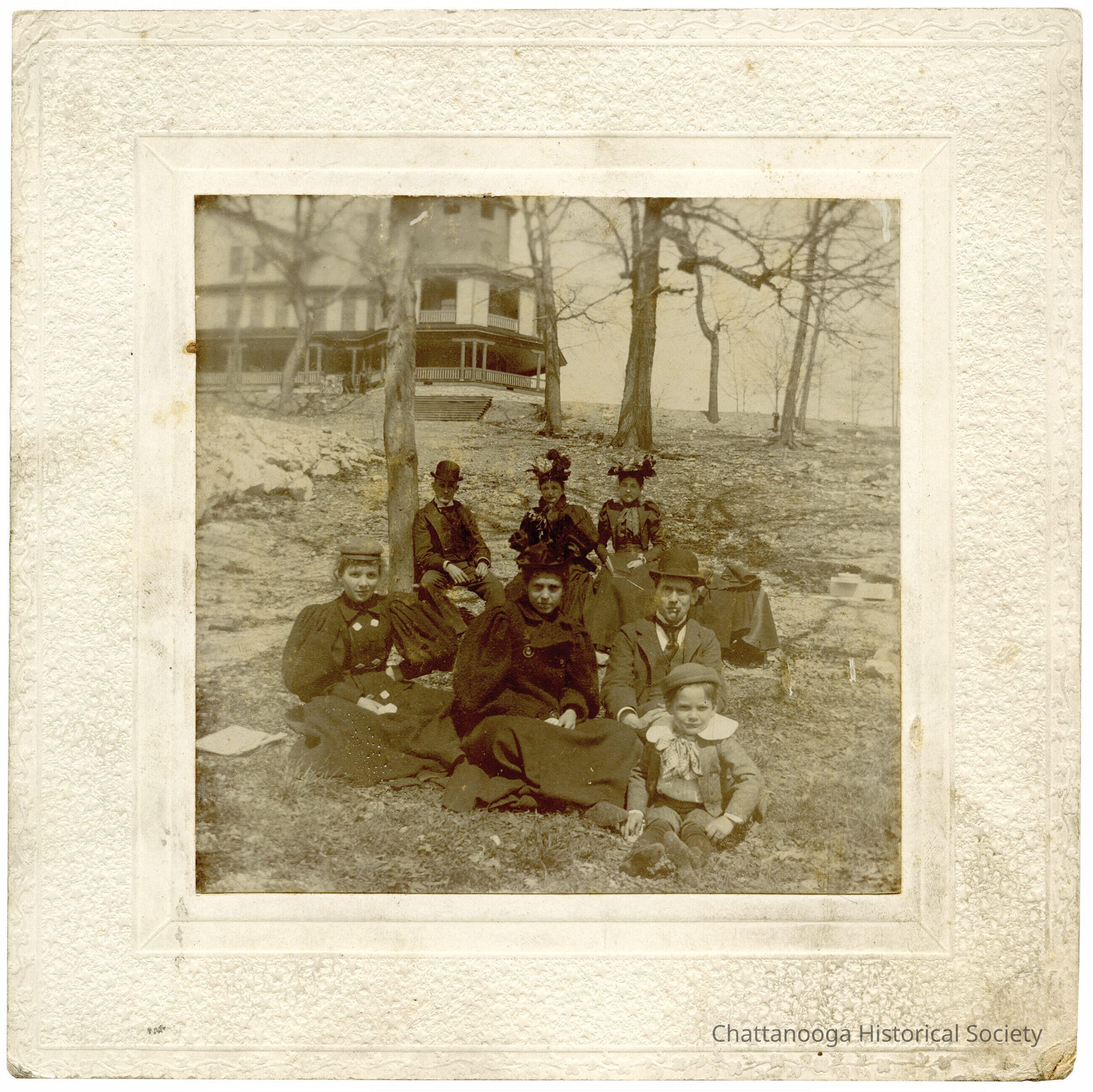 A photograph mounted on a textured card stock of two men, four women, and a young boy at Crawfish Springs, GA. In the background is the Park Hotel. The group is sitting on the ground amid trees, in front of a large building with an octagonal projection. The women are all wearing dark dresses with mutton sleeves.