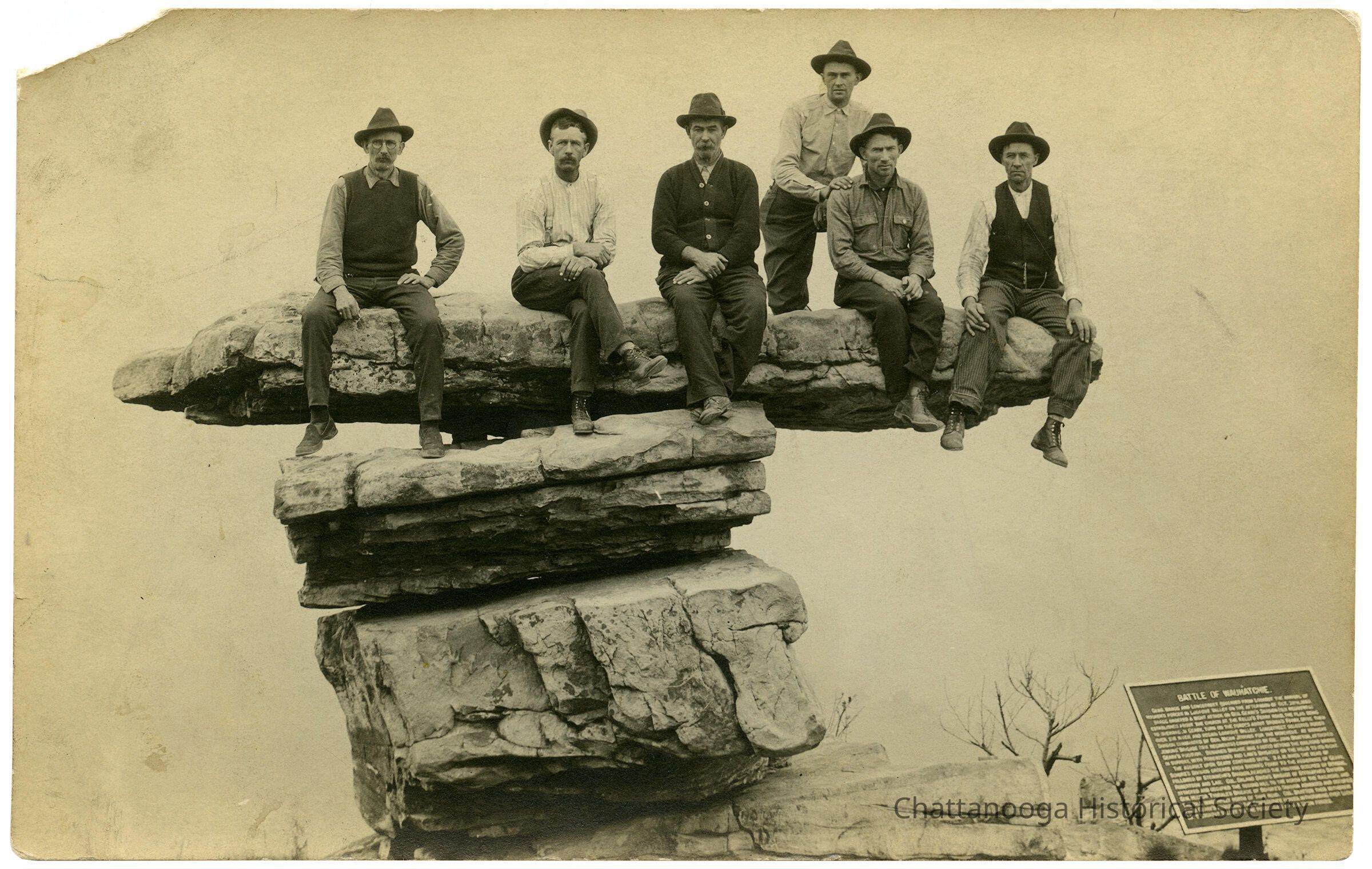 A gelatin printed photographic postcard with the front showing six men posing on Umbrella Rock atop Lookout Mountain. A sign at the bottom left describes The Battle of Wauhatchie that took place in the valley below.