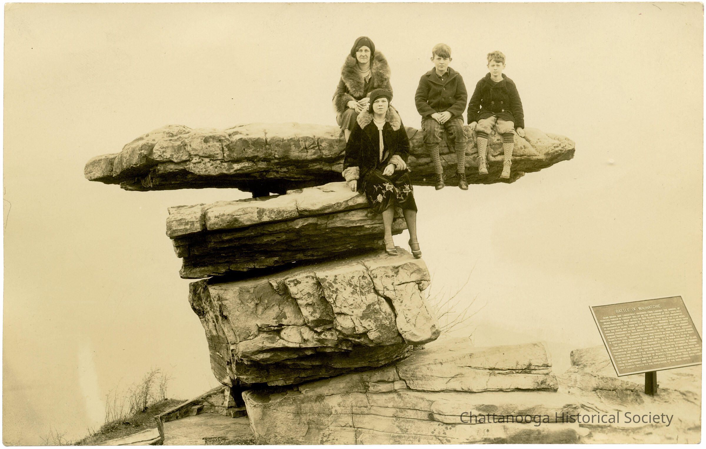 A postcard with the front showing two women and two children on Umbrella Rock on Lookout Mountain. Both women are earring hats as well as coats with fur collars. The two boys are wearing knee breeches and coats. A sign at the bottom left describes The Battle of Wauhatchie that took place in the valley below.
