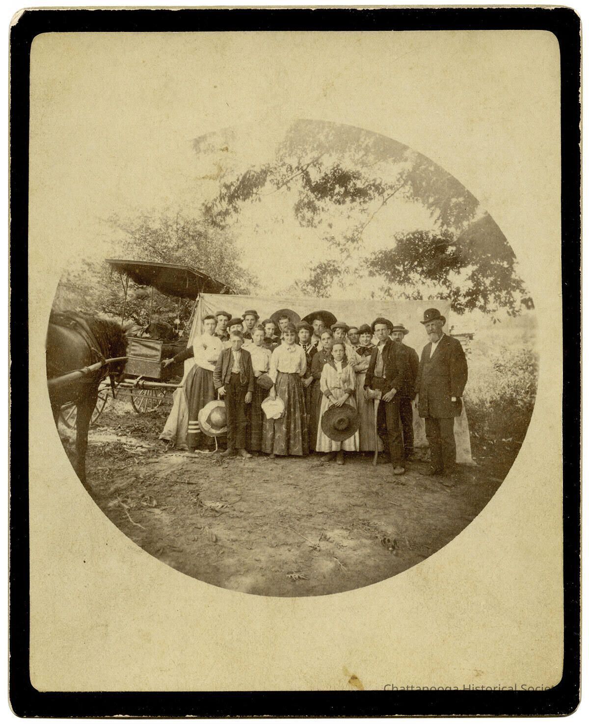 A black and white photograph mounted on cabinet card of a family group. The photograph was taken during the 1890 United Confederate Veterans Reunion. The photograph shows a family posed in front of a white sheet that has been hung between a tree and a carriage. The family group consists of three rows of men and women with the man on the far right, presumably Grandfather Robert, missing an arm.