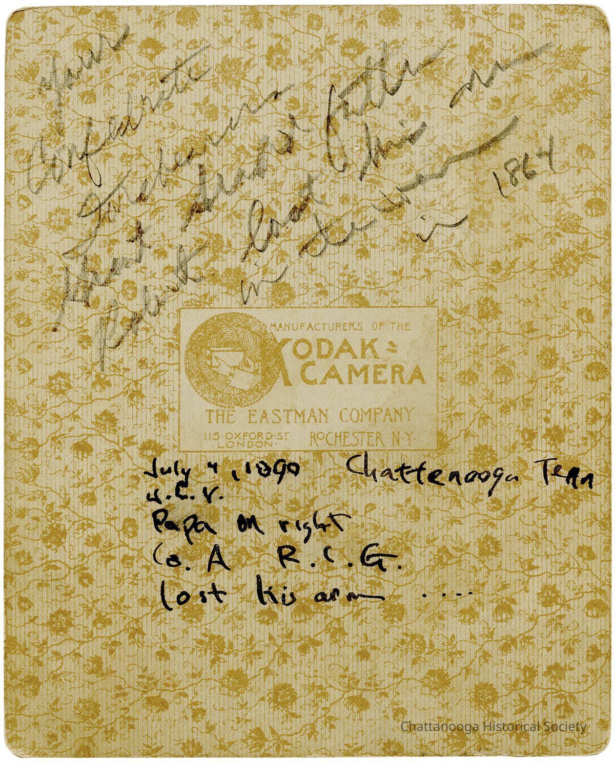Written in pencil on the back is "Your Confederate [illeg.] Great Grandfather[?] Robert lost his arm in the 1864." Below that in black ink reads: