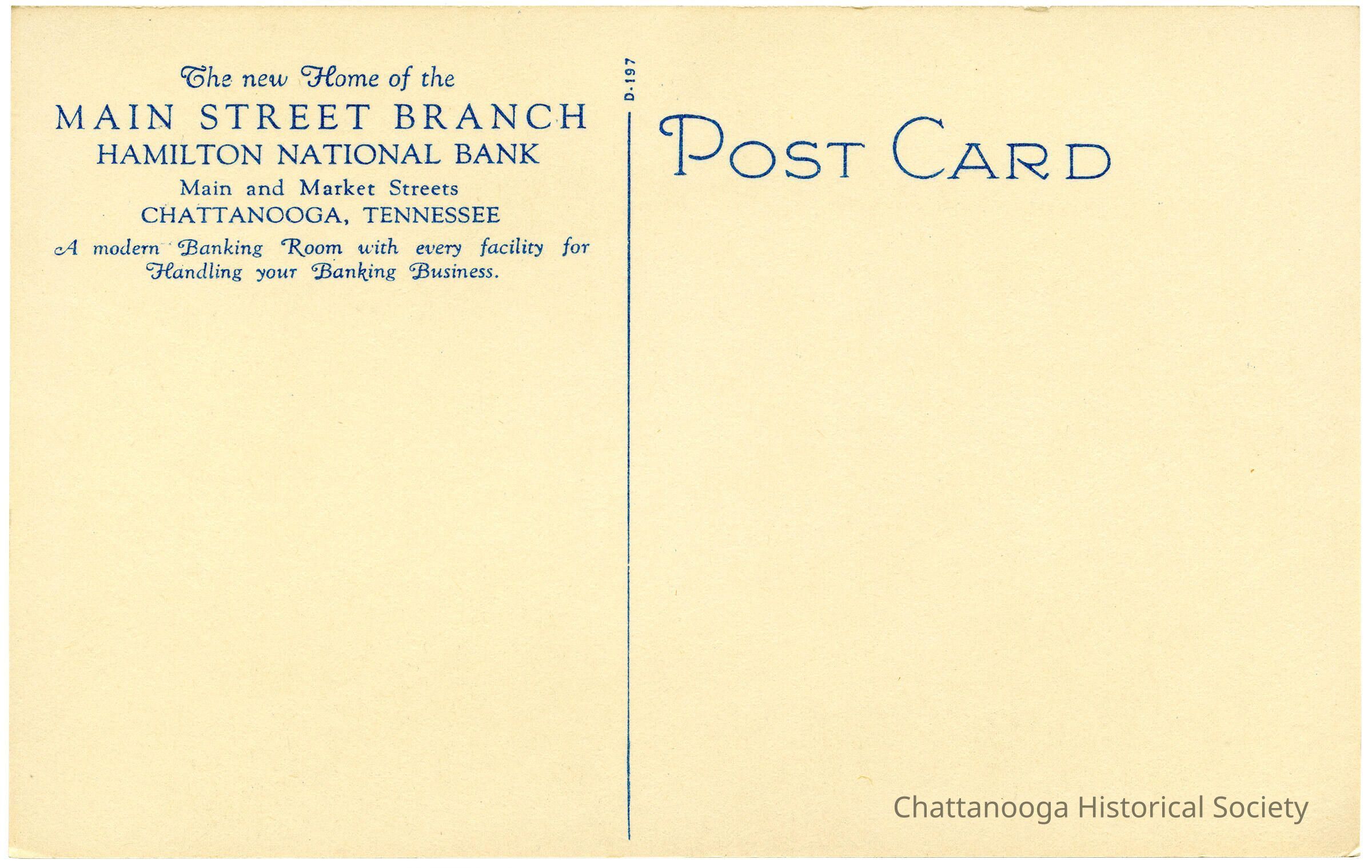 A postcard with the front showing an illustration of the Main Street branch of the Hamilton National Bank at Market and Main Streets in Chattanooga, Tennessee. The verso advertising text reads "The new Home of the MAIN STREET BRANCH HAMILTON NATIONAL BANK Main and Market Streets Chattanooga, Tennessee